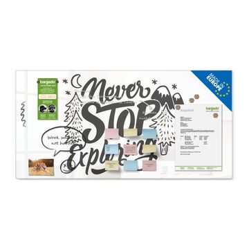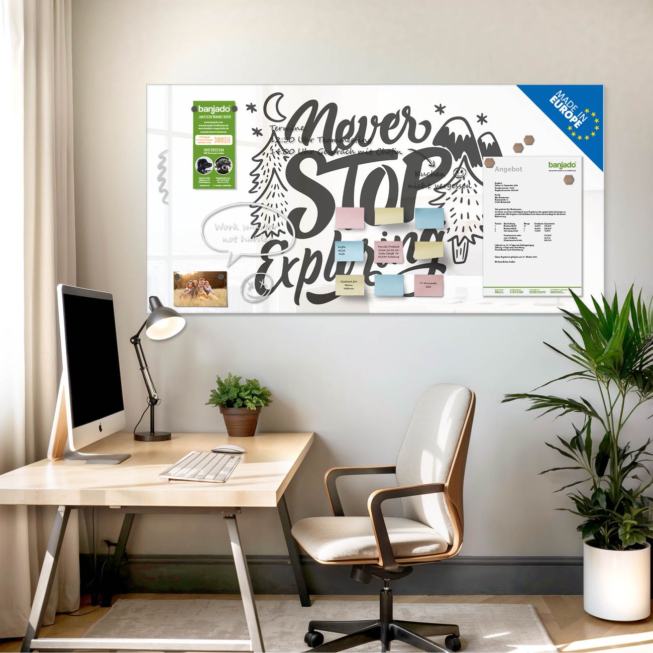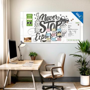 Material: 4mm Sicherheitsglas mit Metallrückwand Eigenschaften: beschreibbar, magnetisch, kratzfest Maße: 100x50x0,6cm, 7,50kg schwer Motiv Nummer 13370 Abenteuerlust Zubehör: inklusive 4 Neodym-Magnete