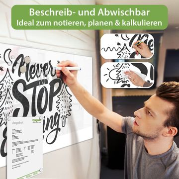 Auf der glatten Glasoberfläche lassen sich Termine, Rezepte oder Notizen ganz einfach mit Kreidestiften festhalten und rückstandslos entfernen. Starke Neodym-Magnete halten Ihre wichtigsten Erinnerungen sicher an Ort und Stelle. So entsteht Ihre ganz persönliche Ideenwand - jeden Tag neu.