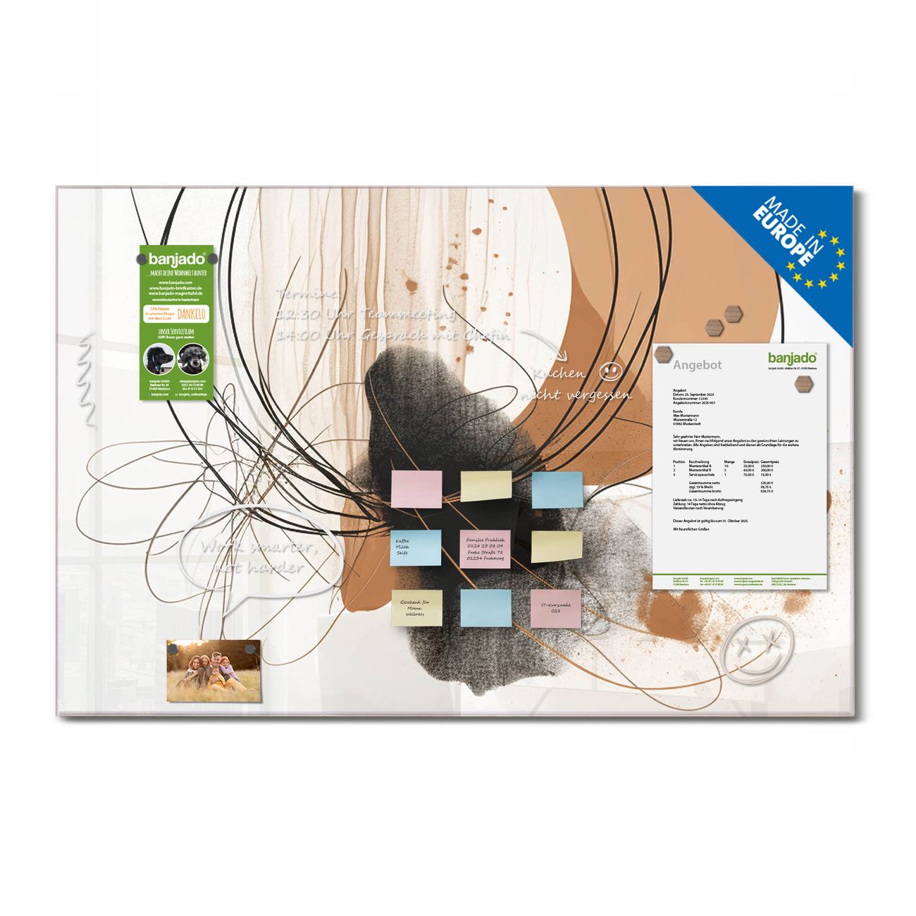 Jede Glas Magnettafel wird in unserer Werkstatt von Hand gefertigt und sorgfältig geprüft. So erhalten Sie ein echtes Qualitätsprodukt, das Funktion und Ästhetik perfekt vereint.?? Warum banjado?