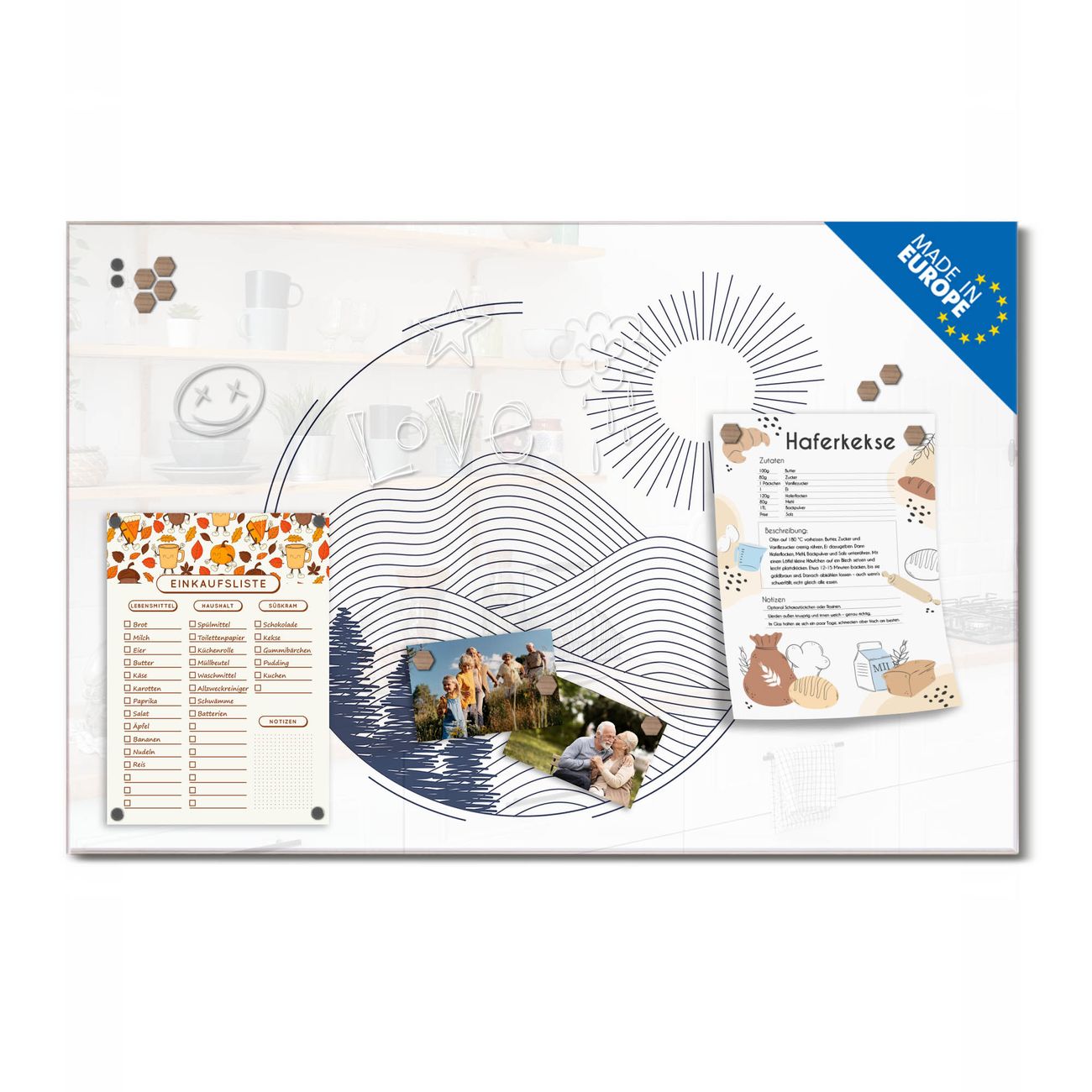 Ein Stück Design, das Ihren Alltag organisiert. Schreiben, heften, inspirieren - alles an einem Ort. Qualität, die man spürt. Montage leicht gemacht. Handwerk mit Herz - veredelt in Sachsen. Einzigartiges Design mit Motiv Motiv Abstrakte Landschaft Beschreibbare Glasoberfläche, leicht zu reinigen Starke Magnetkraft durch Stahlrückwand Inklusive 4 Neodym-Magneten Flexible Montageoptionen Handveredelt in Sachsen - Qualität, die bleibt