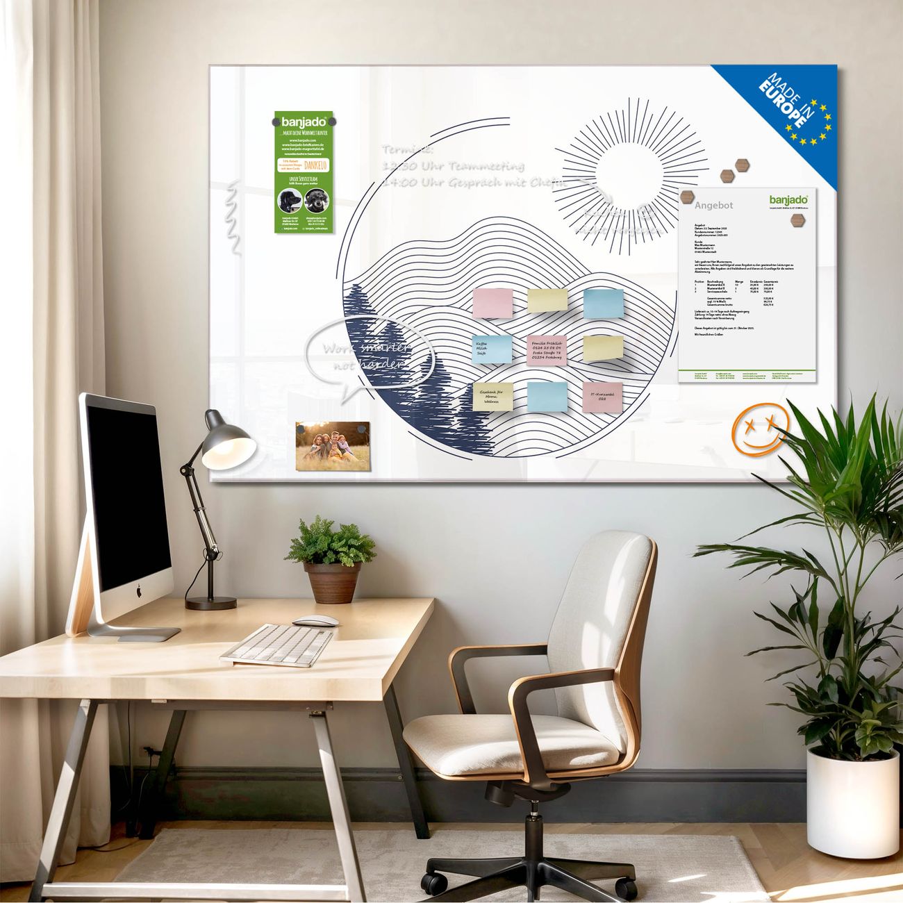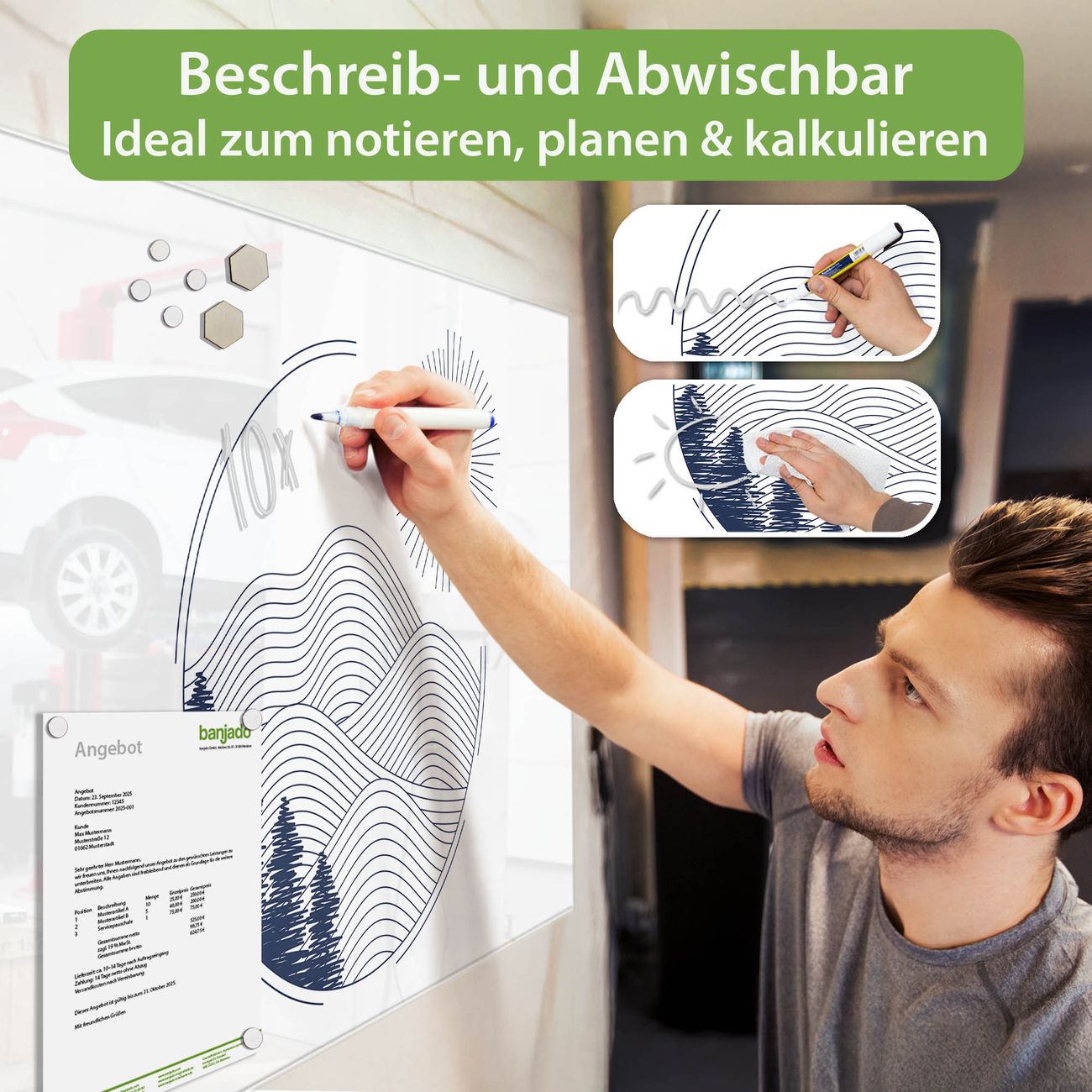 Jede Glas Magnettafel wird in unserer Werkstatt von Hand gefertigt und sorgfältig geprüft. So erhalten Sie ein echtes Qualitätsprodukt, das Funktion und Ästhetik perfekt vereint.?? Warum banjado?