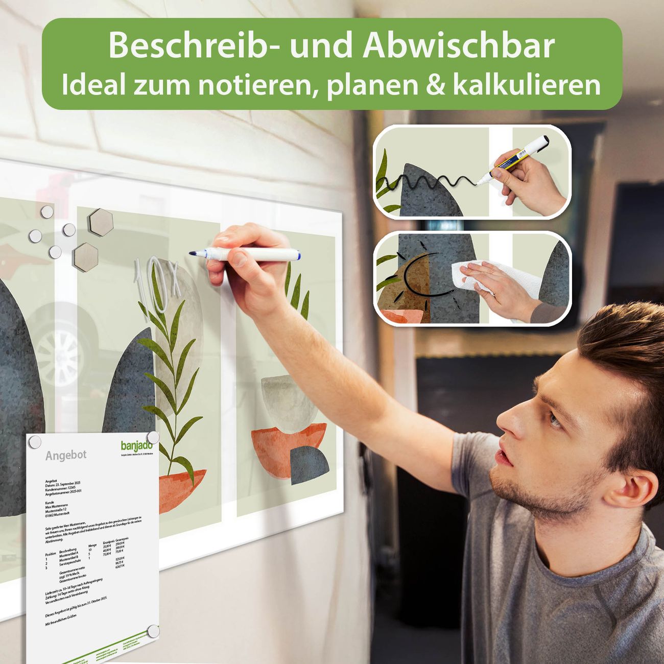 Jede Glas Magnettafel wird in unserer Werkstatt von Hand gefertigt und sorgfältig geprüft. So erhalten Sie ein echtes Qualitätsprodukt, das Funktion und Ästhetik perfekt vereint.?? Warum banjado?