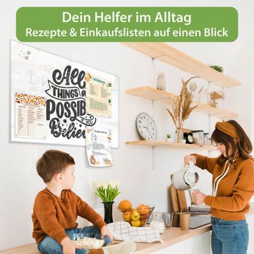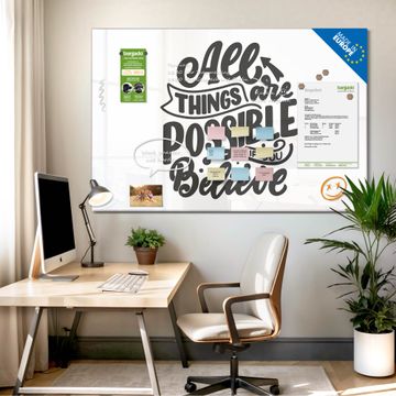 Material: 4mm Sicherheitsglas mit Metallrückwand Eigenschaften: beschreibbar, magnetisch, kratzfest Maße: 120x80x0,6cm, 14,40kg schwer Motiv Nummer 13091 All Things are possible 2 Zubehör: inklusive 4 Neodym-Magnete