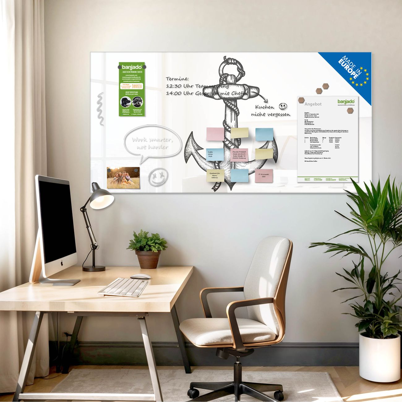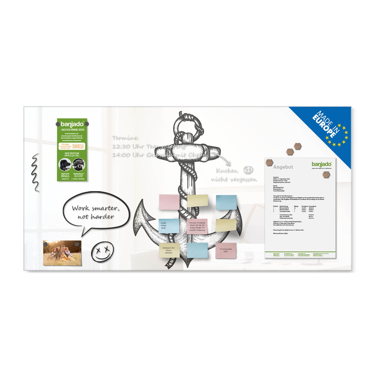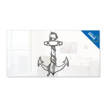 Material: 4mm Sicherheitsglas mit Metallrückwand Eigenschaften: beschreibbar, magnetisch, kratzfest Maße: 100x50x0,6cm, 7,50kg schwer Motiv Nummer 13057 Anker 2 Zubehör: inklusive 4 Neodym-Magnete