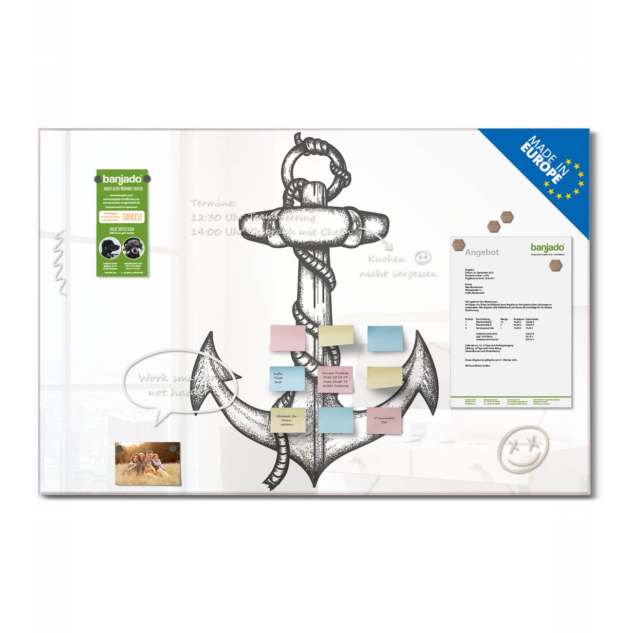 Jede Glas Magnettafel wird in unserer Werkstatt von Hand gefertigt und sorgfältig geprüft. So erhalten Sie ein echtes Qualitätsprodukt, das Funktion und Ästhetik perfekt vereint.?? Warum banjado?
