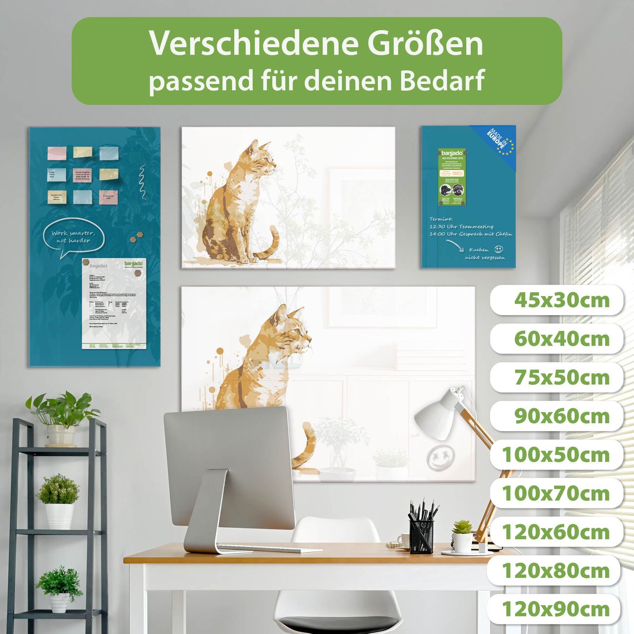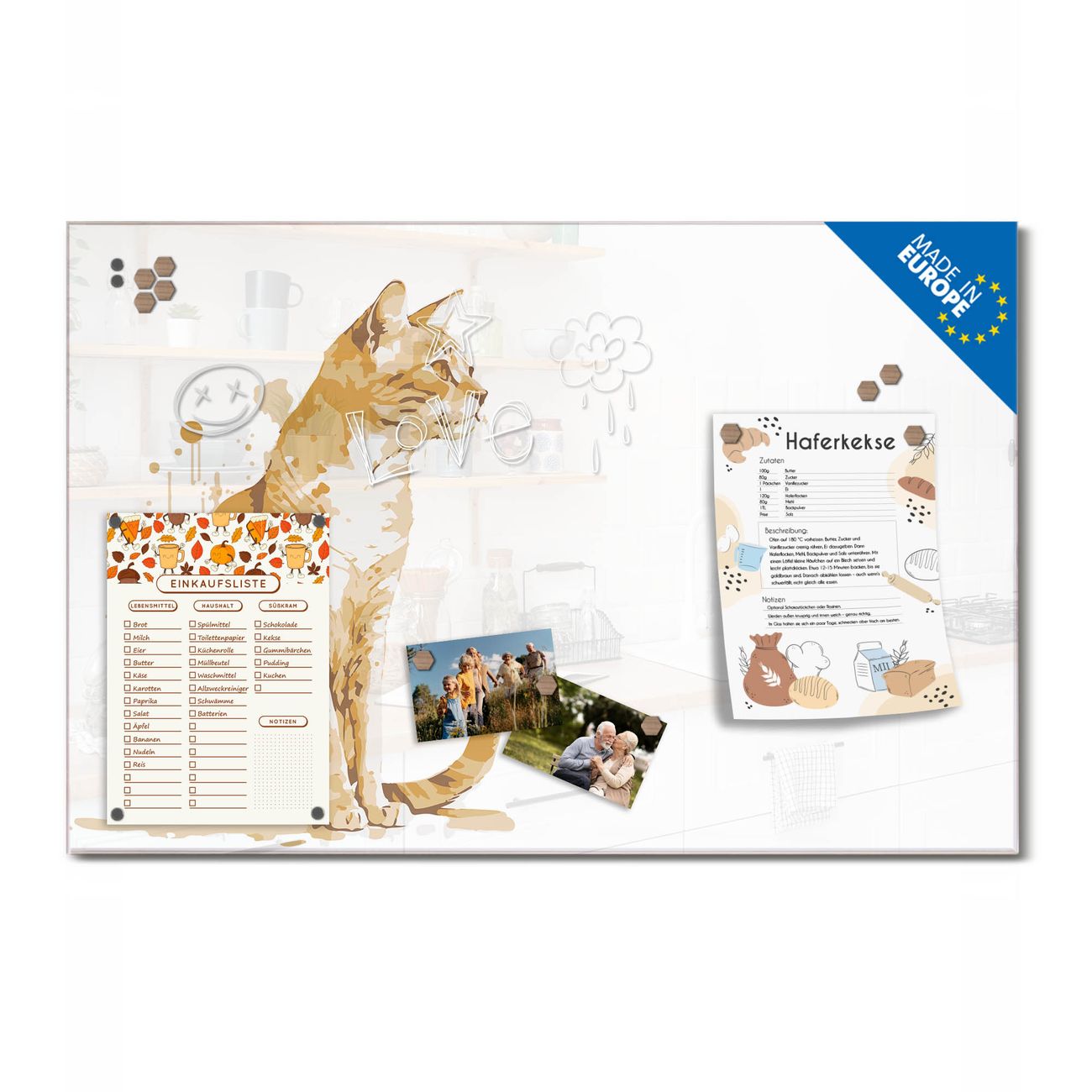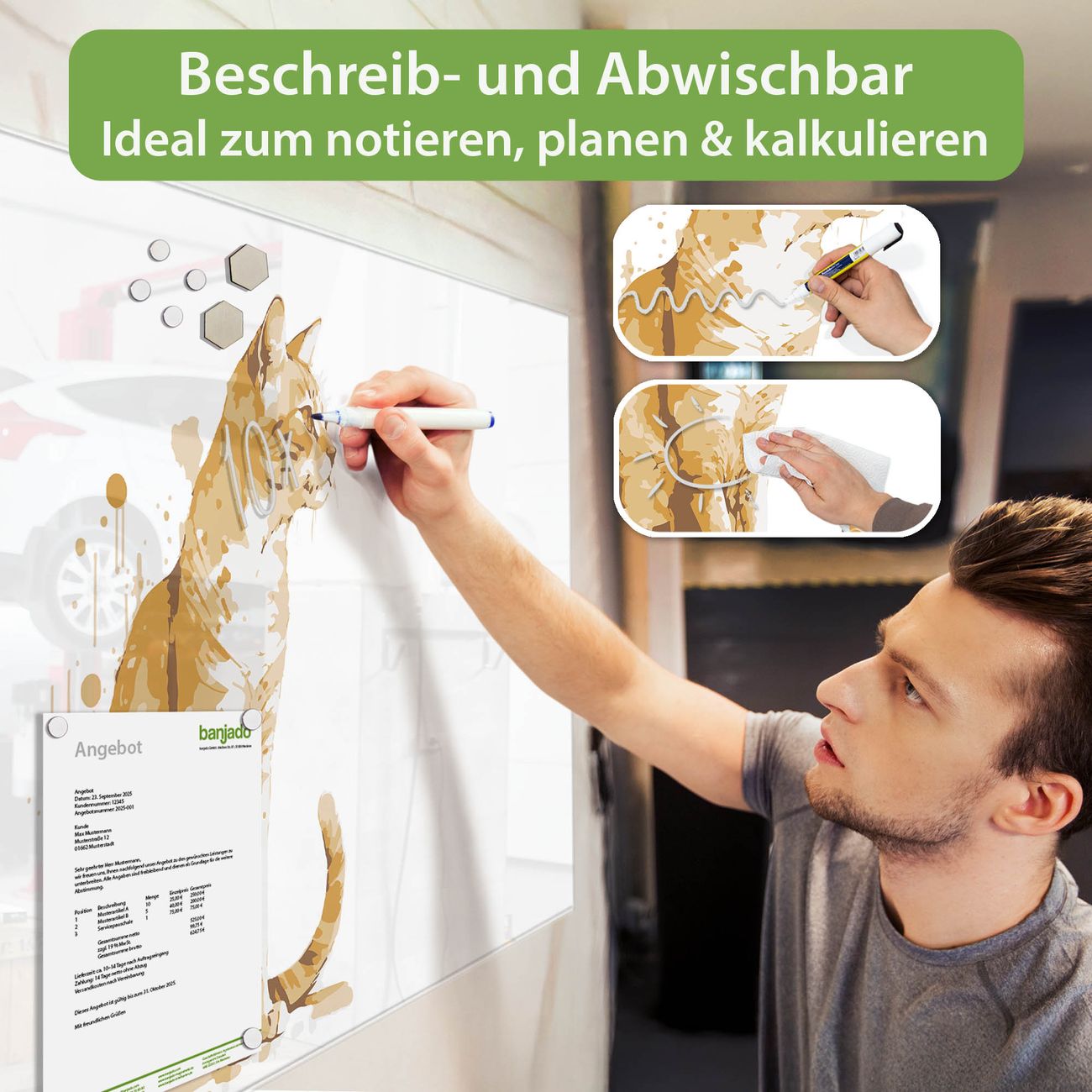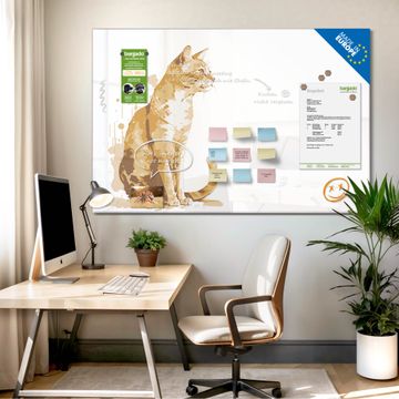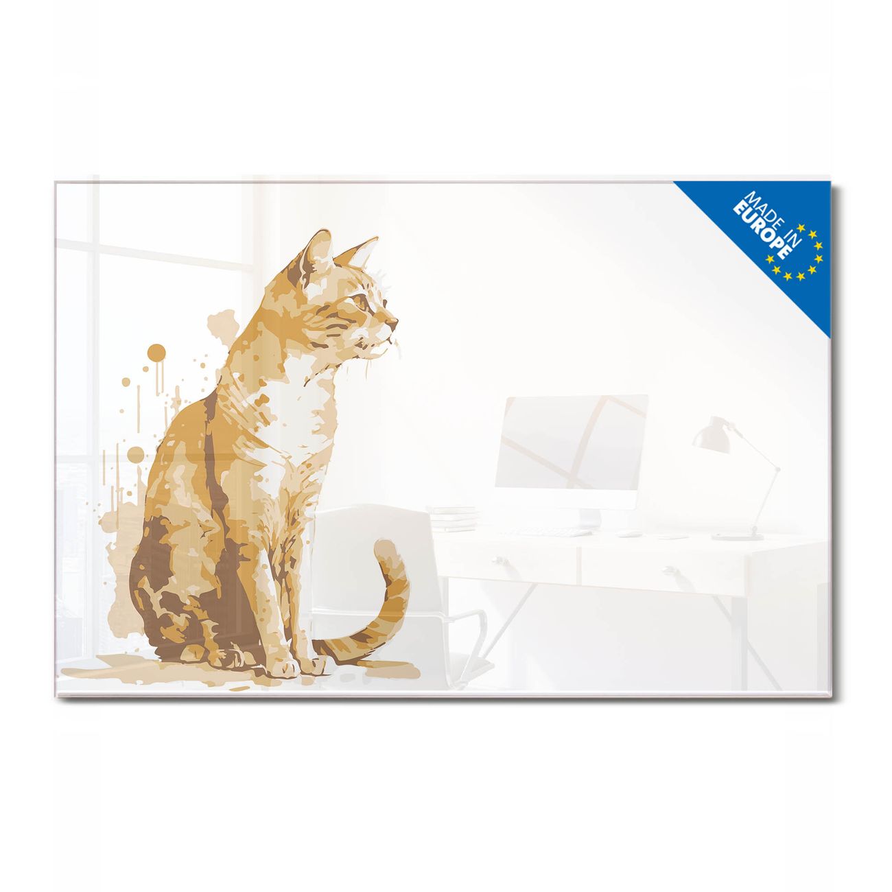 Material: 4mm Sicherheitsglas mit Metallrückwand Eigenschaften: beschreibbar, magnetisch, kratzfest Maße: 75x50x0,6cm, 5,63kg schwer Motiv Nummer 13450 Aquarellkatze 3 Zubehör: inklusive 4 Neodym-Magnete