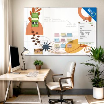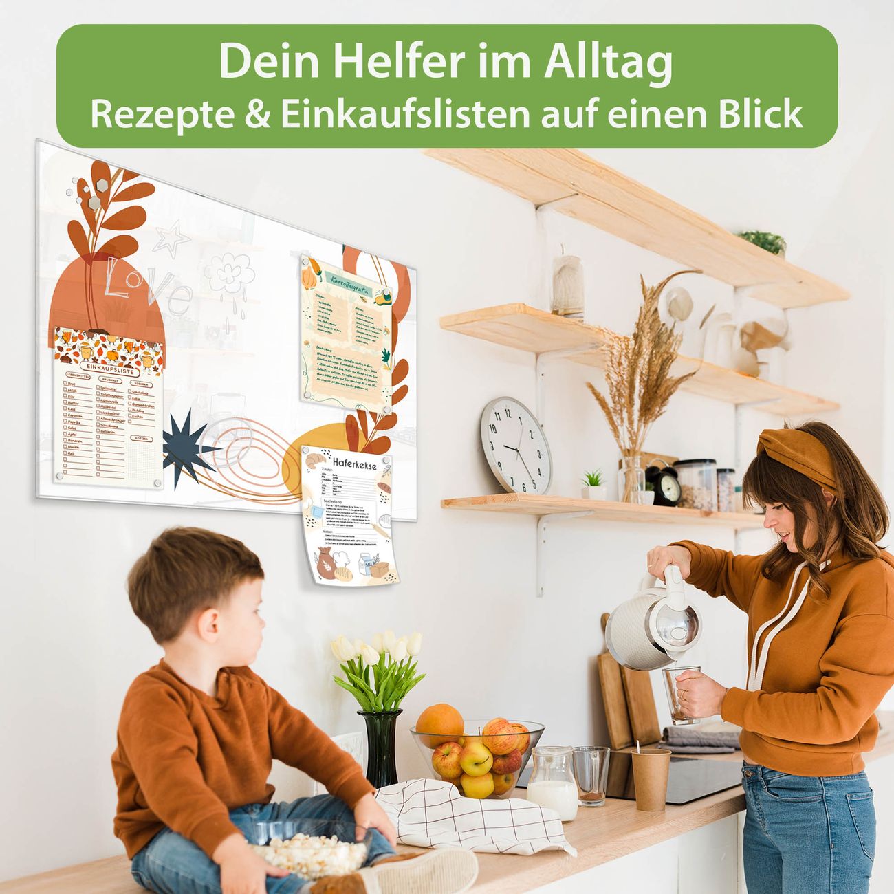 Auf der glatten Glasoberfläche lassen sich Termine, Rezepte oder Notizen ganz einfach mit Kreidestiften festhalten und rückstandslos entfernen. Starke Neodym-Magnete halten Ihre wichtigsten Erinnerungen sicher an Ort und Stelle. So entsteht Ihre ganz persönliche Ideenwand - jeden Tag neu.