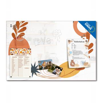 Material: 4mm Sicherheitsglas mit Metallrückwand Eigenschaften: beschreibbar, magnetisch, kratzfest Maße: 75x50x0,6cm, 5,63kg schwer Motiv Nummer 13524 Astro-Herbstkranz Zubehör: inklusive 4 Neodym-Magnete