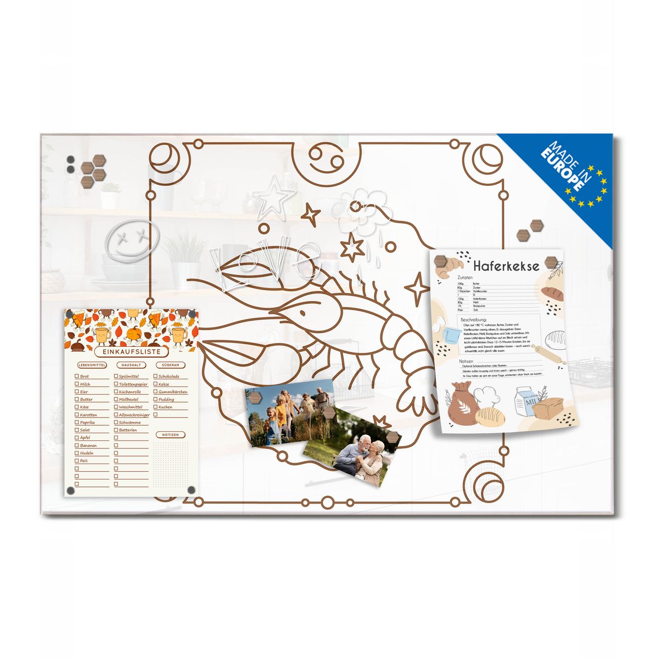 Ein Stück Design, das Ihren Alltag organisiert. Schreiben, heften, inspirieren - alles an einem Ort. Qualität, die man spürt. Montage leicht gemacht. Handwerk mit Herz - veredelt in Sachsen. Einzigartiges Design mit Motiv Motiv Astrologisches Krebsdesign Beschreibbare Glasoberfläche, leicht zu reinigen Starke Magnetkraft durch Stahlrückwand Inklusive 4 Neodym-Magneten Flexible Montageoptionen Handveredelt in Sachsen - Qualität, die bleibt