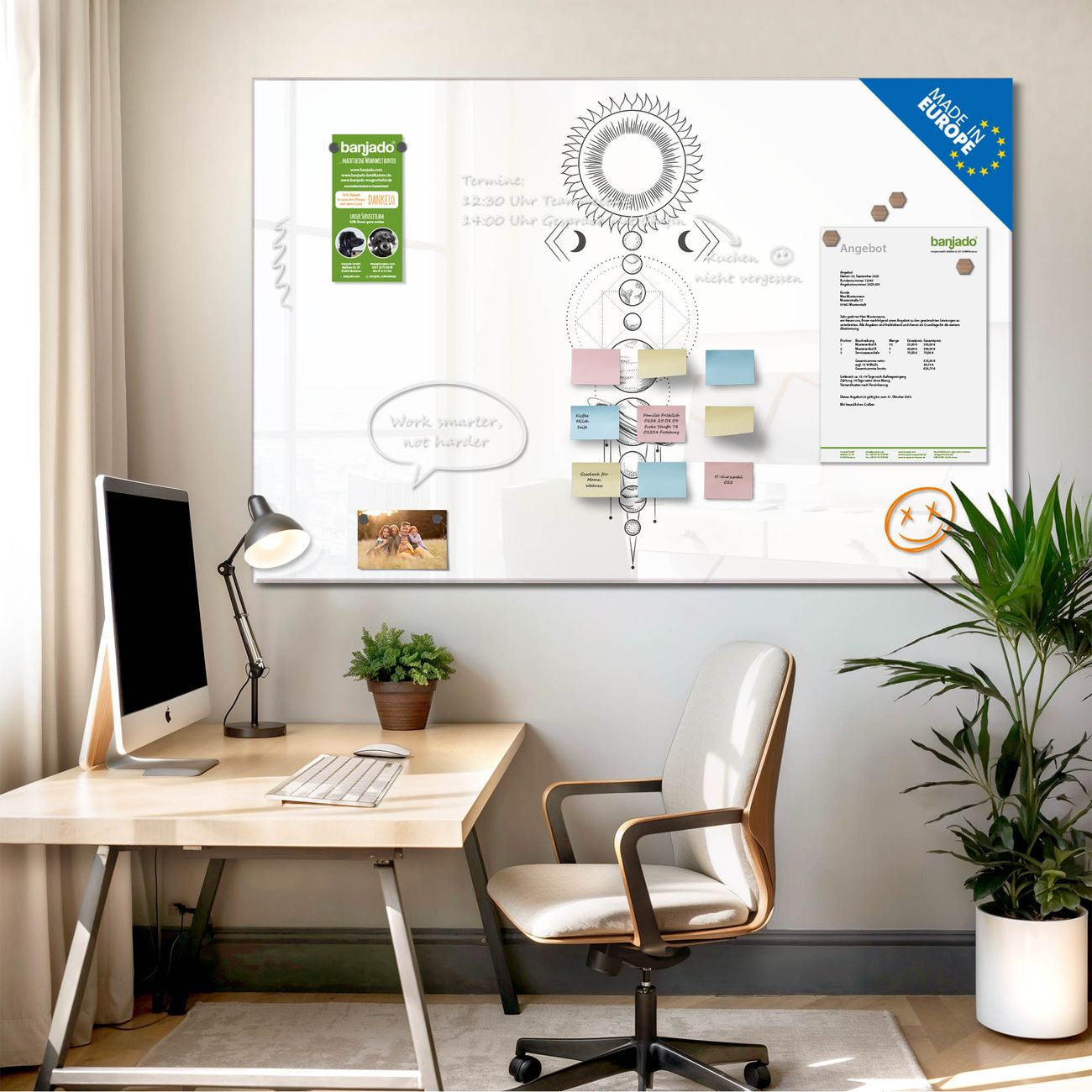 Jede Glas Magnettafel wird in unserer Werkstatt von Hand gefertigt und sorgfältig geprüft. So erhalten Sie ein echtes Qualitätsprodukt, das Funktion und Ästhetik perfekt vereint.?? Warum banjado?