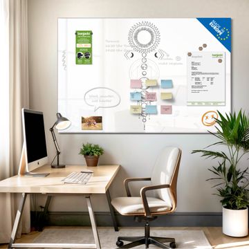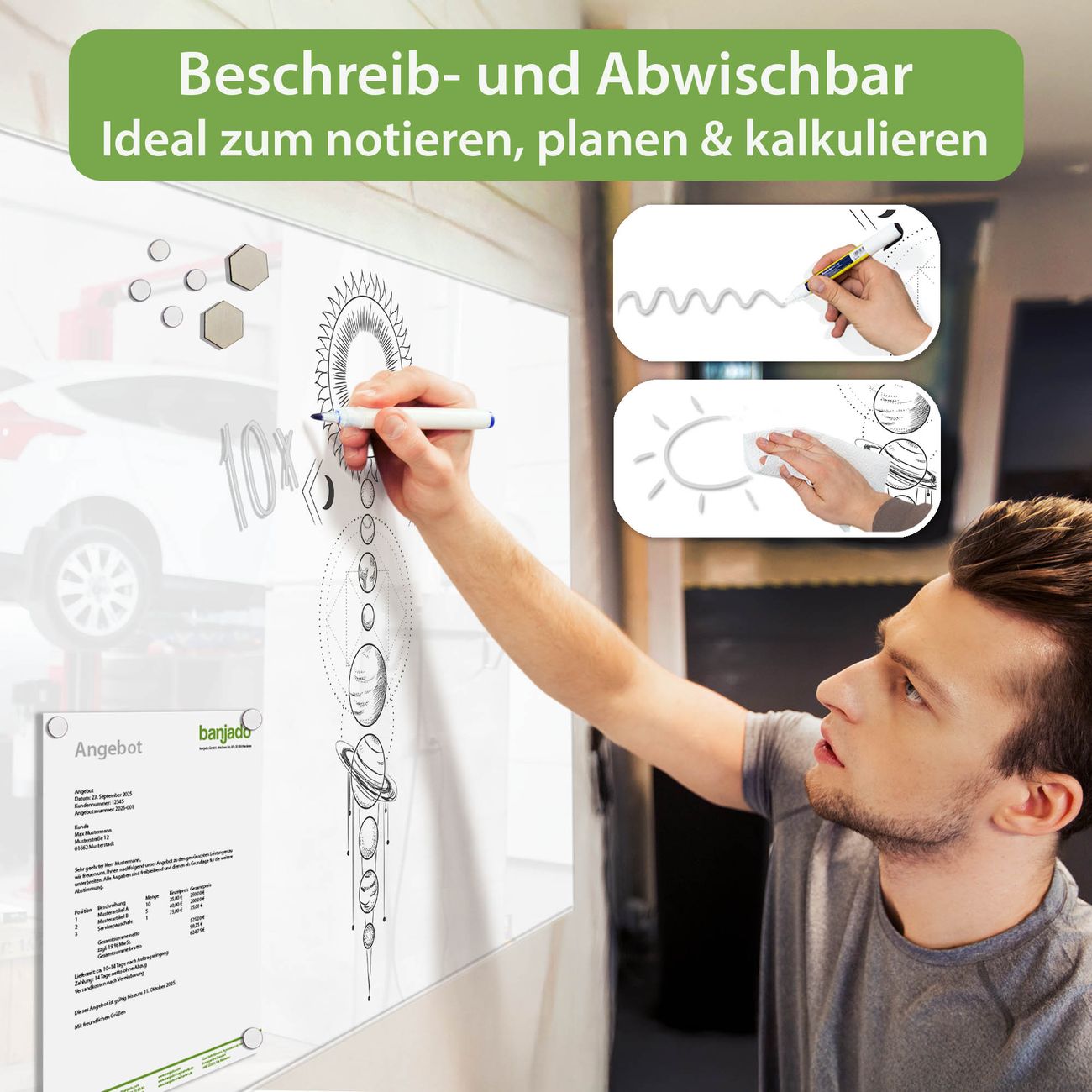Auf der glatten Glasoberfläche lassen sich Termine, Rezepte oder Notizen ganz einfach mit Kreidestiften festhalten und rückstandslos entfernen. Starke Neodym-Magnete halten Ihre wichtigsten Erinnerungen sicher an Ort und Stelle. So entsteht Ihre ganz persönliche Ideenwand - jeden Tag neu.