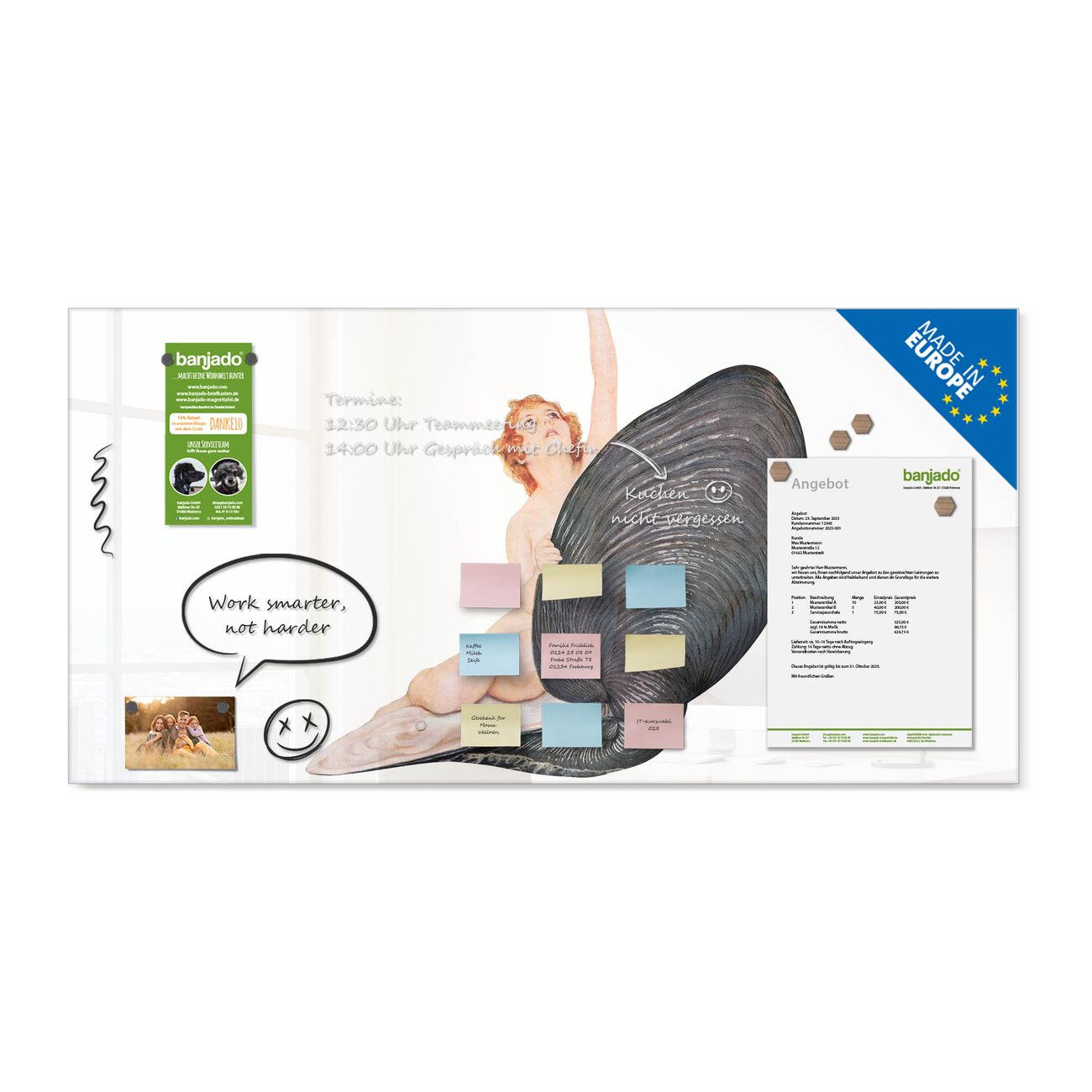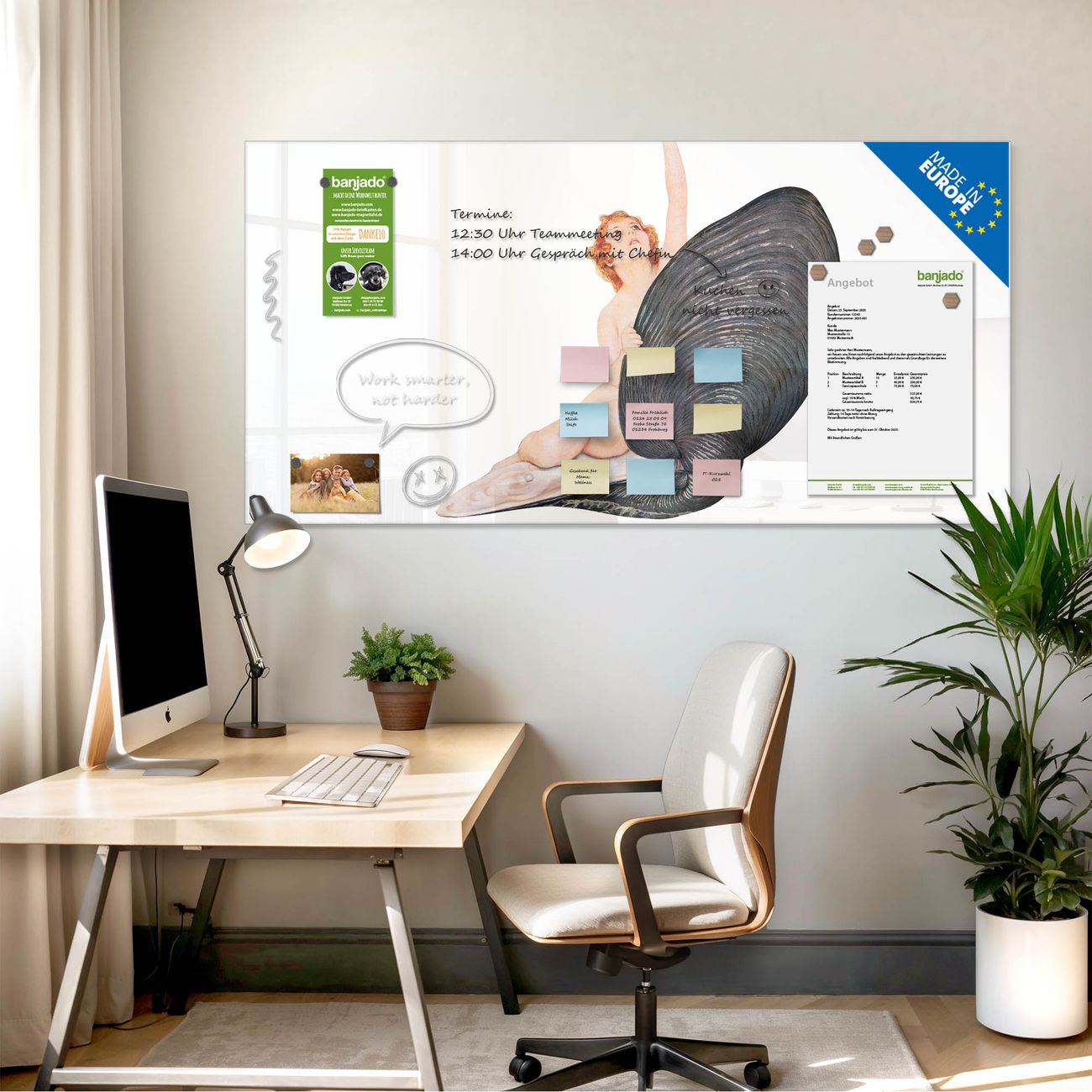 Jede Glas Magnettafel wird in unserer Werkstatt von Hand gefertigt und sorgfältig geprüft. So erhalten Sie ein echtes Qualitätsprodukt, das Funktion und Ästhetik perfekt vereint.?? Warum banjado?
