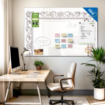 Material: 4mm Sicherheitsglas mit Metallrückwand Eigenschaften: beschreibbar, magnetisch, kratzfest Maße: 75x50x0,6cm, 5,63kg schwer Motiv Nummer 13558 Barocker Bilderrahmen Zubehör: inklusive 4 Neodym-Magnete