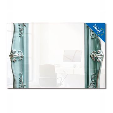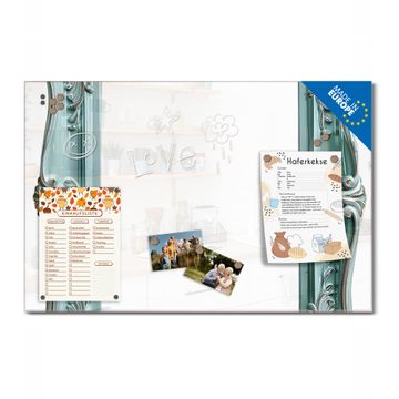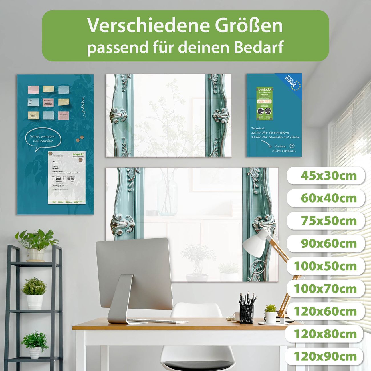 Material: 4mm Sicherheitsglas mit Metallrückwand Eigenschaften: beschreibbar, magnetisch, kratzfest Maße: 75x50x0,6cm, 5,63kg schwer Motiv Nummer 13559 Barockrahmen in Türkis Zubehör: inklusive 4 Neodym-Magnete