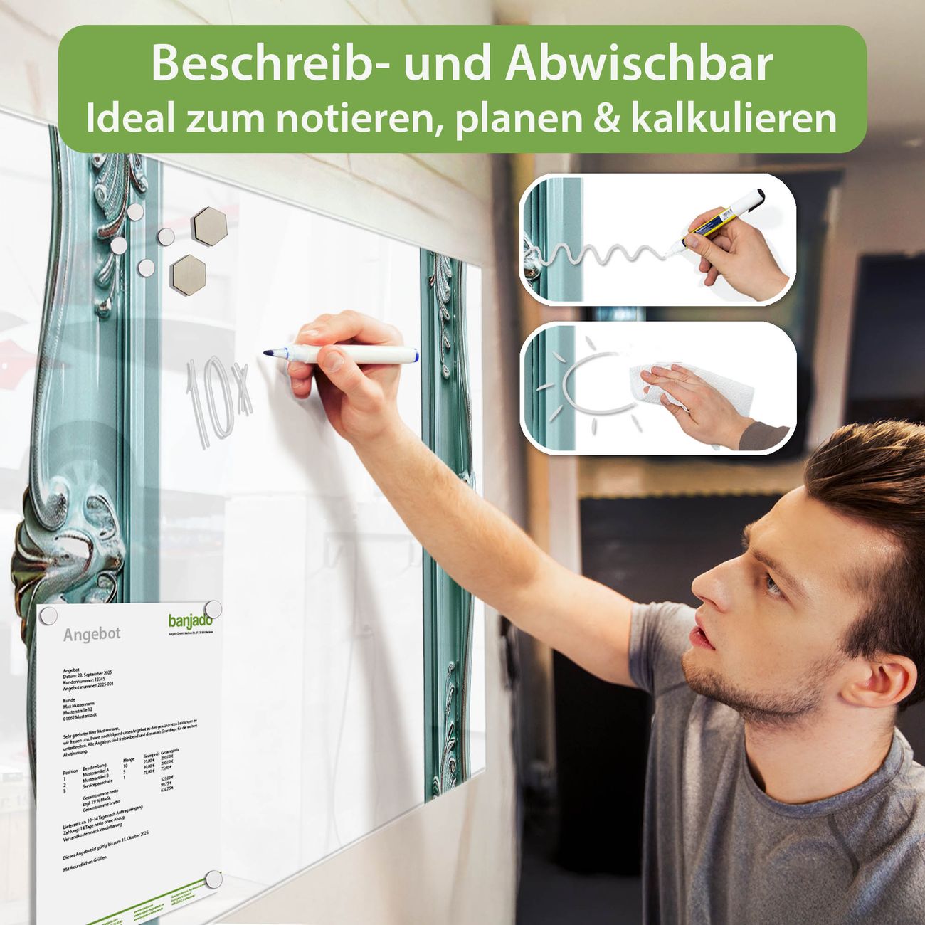 Jede Glas Magnettafel wird in unserer Werkstatt von Hand gefertigt und sorgfältig geprüft. So erhalten Sie ein echtes Qualitätsprodukt, das Funktion und Ästhetik perfekt vereint.?? Warum banjado?