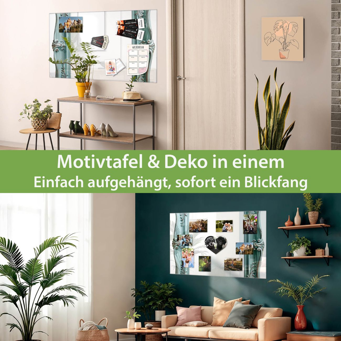 Ein Stück Design, das Ihren Alltag organisiert. Schreiben, heften, inspirieren - alles an einem Ort. Qualität, die man spürt. Montage leicht gemacht. Handwerk mit Herz - veredelt in Sachsen. Einzigartiges Design mit Motiv Motiv Barockrahmen in Türkis Beschreibbare Glasoberfläche, leicht zu reinigen Starke Magnetkraft durch Stahlrückwand Inklusive 4 Neodym-Magneten Flexible Montageoptionen Handveredelt in Sachsen - Qualität, die bleibt