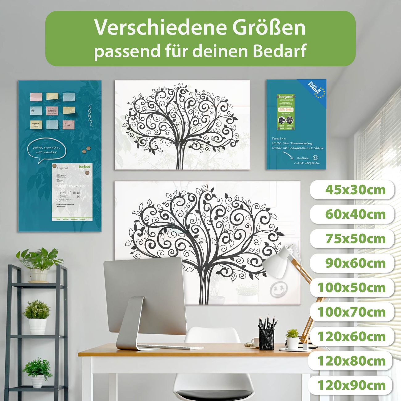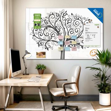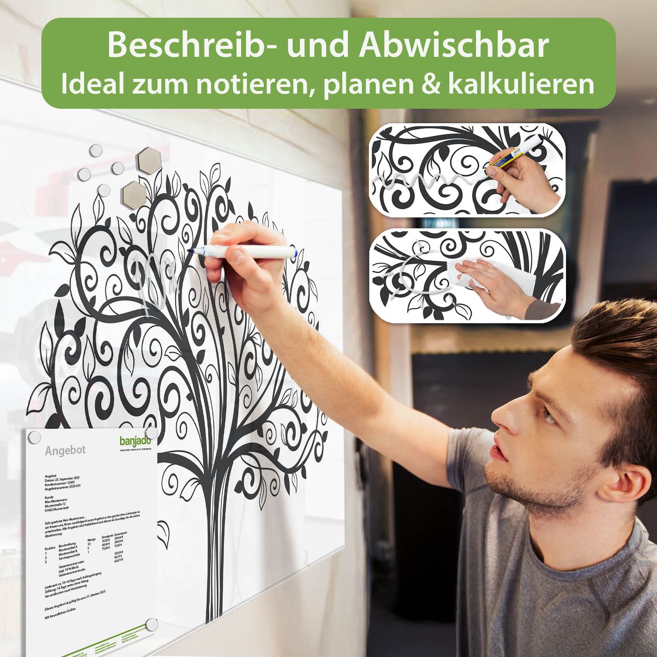 Material: 4mm Sicherheitsglas mit Metallrückwand Eigenschaften: beschreibbar, magnetisch, kratzfest Maße: 120x80x0,6cm, 14,40kg schwer Motiv Nummer 13336 Baum des Lebens Zubehör: inklusive 4 Neodym-Magnete