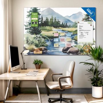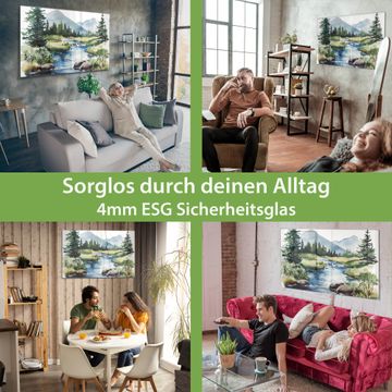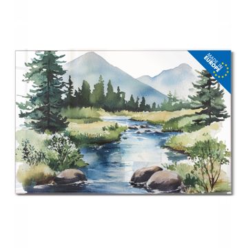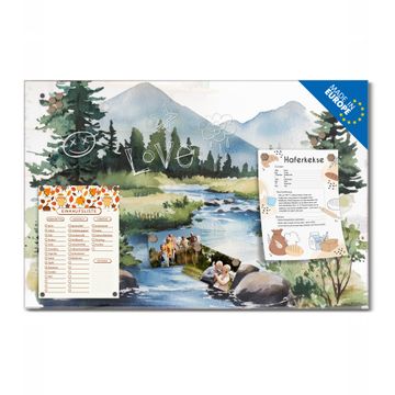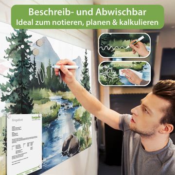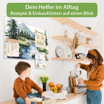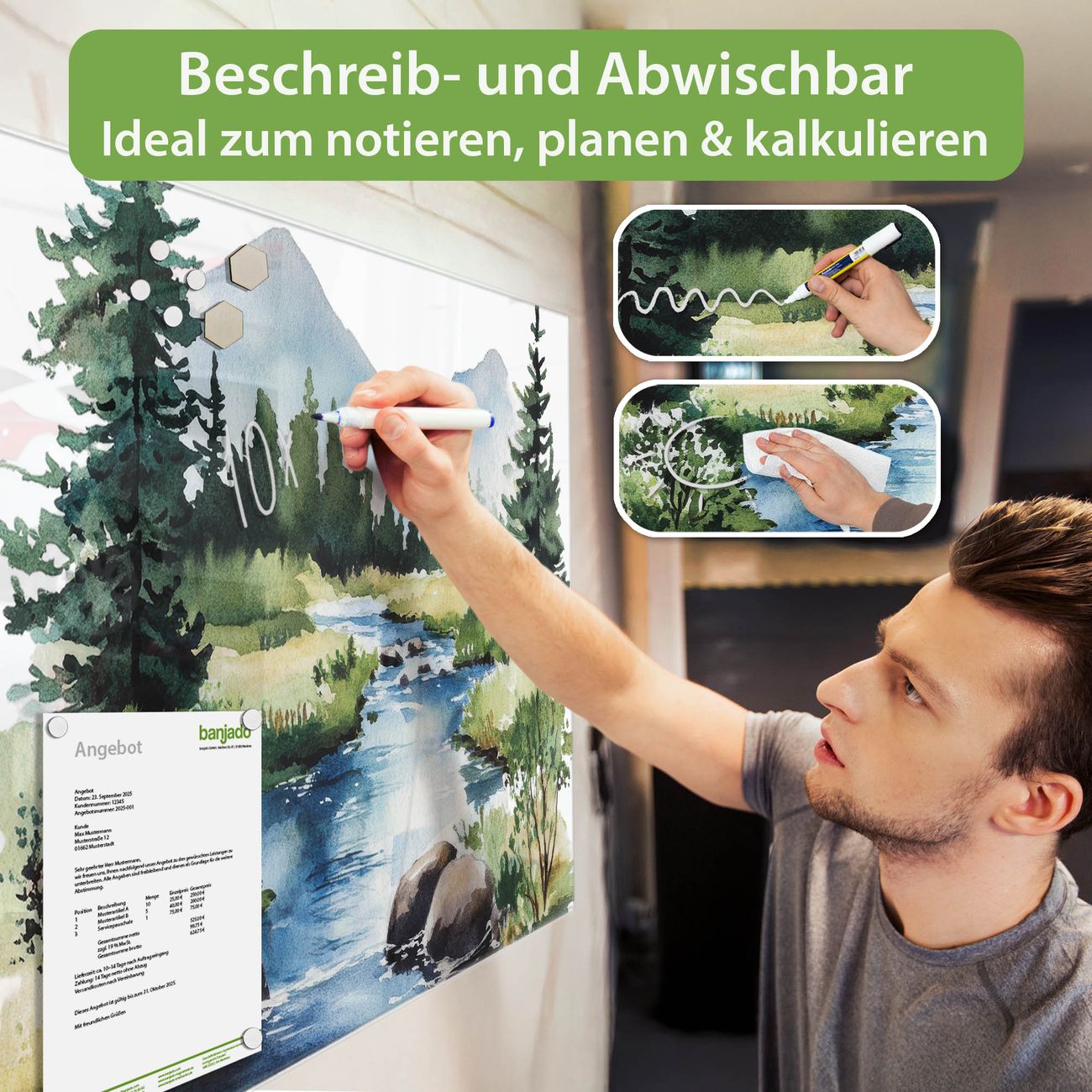 Material: 4mm Sicherheitsglas mit Metallrückwand Eigenschaften: beschreibbar, magnetisch, kratzfest Maße: 75x50x0,6cm, 5,63kg schwer Motiv Nummer 13277 Bergfluss in der Natur Zubehör: inklusive 4 Neodym-Magnete