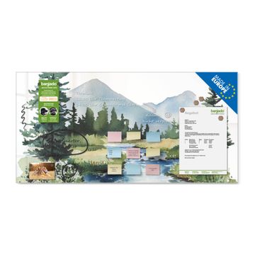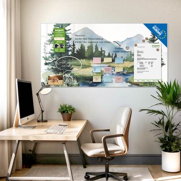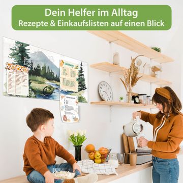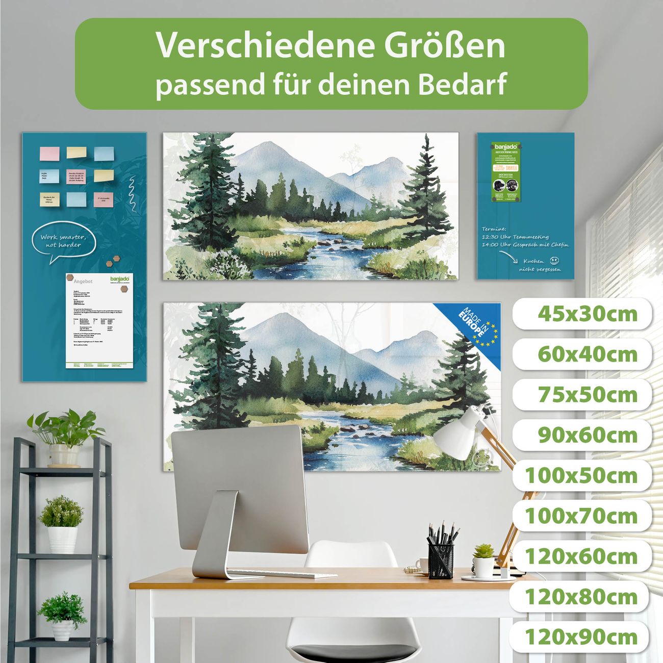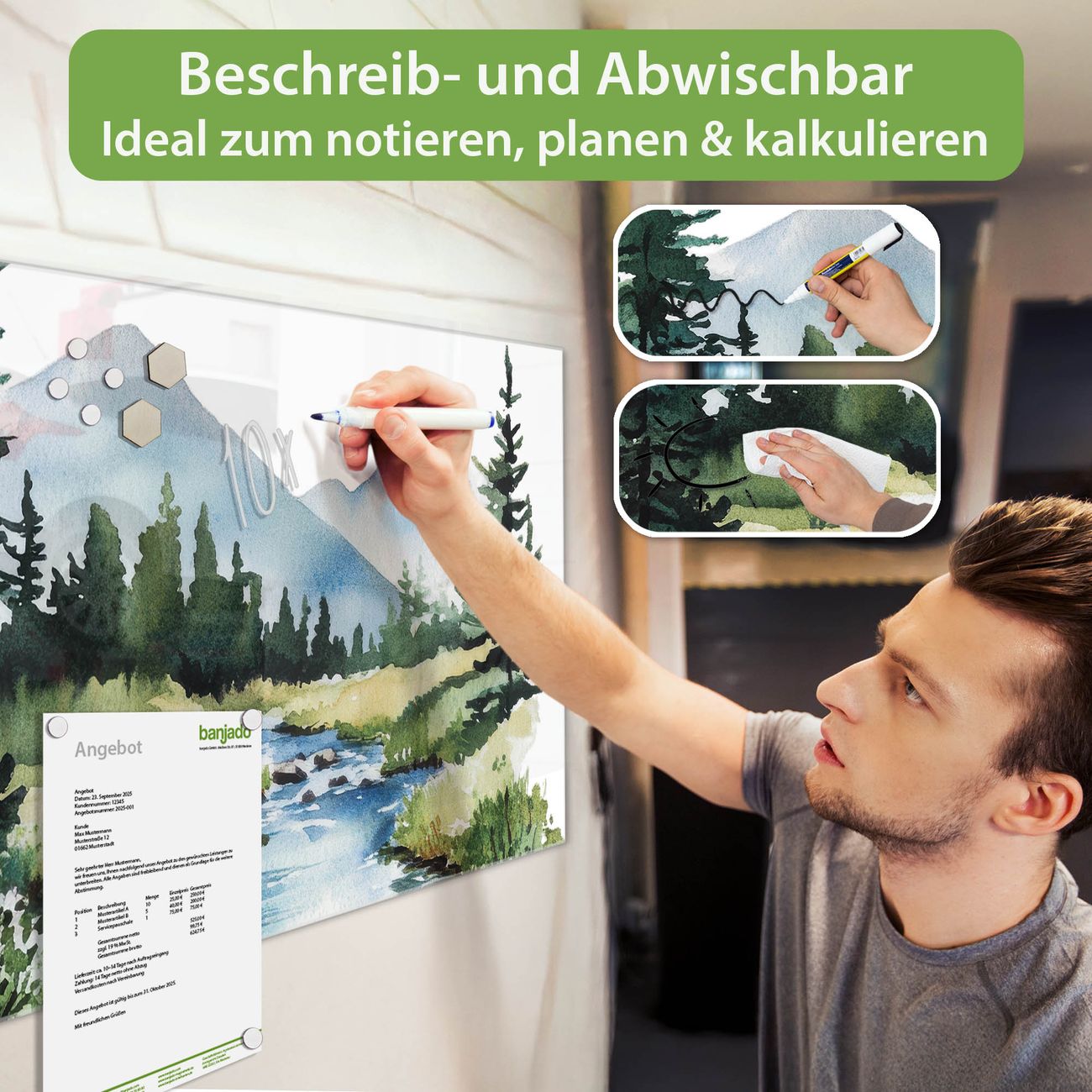 Material: 4mm Sicherheitsglas mit Metallrückwand Eigenschaften: beschreibbar, magnetisch, kratzfest Maße: 100x50x0,6cm, 7,50kg schwer Motiv Nummer 13277 Bergfluss in der Natur Zubehör: inklusive 4 Neodym-Magnete