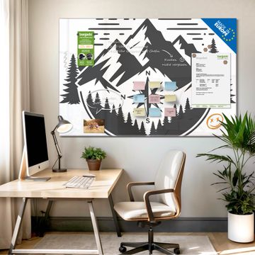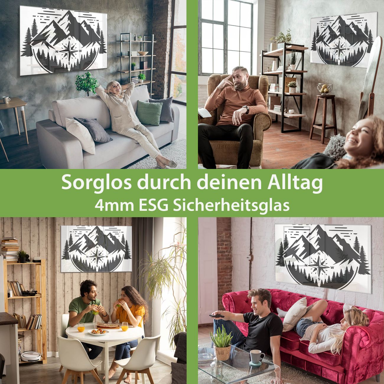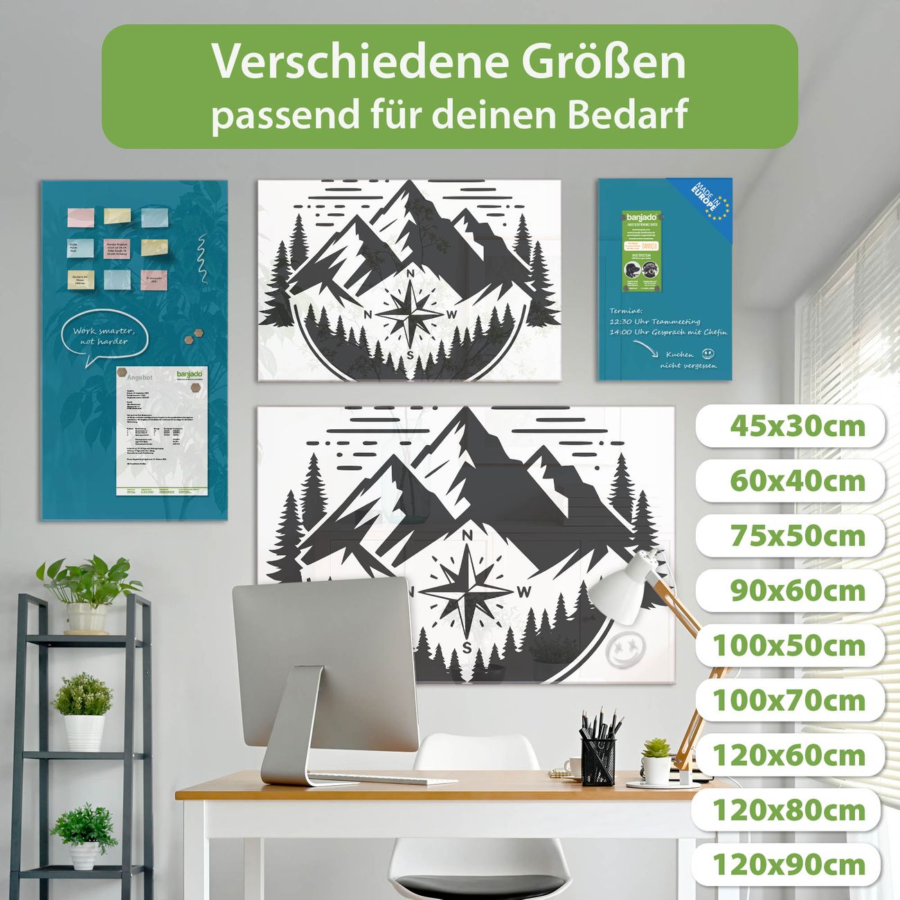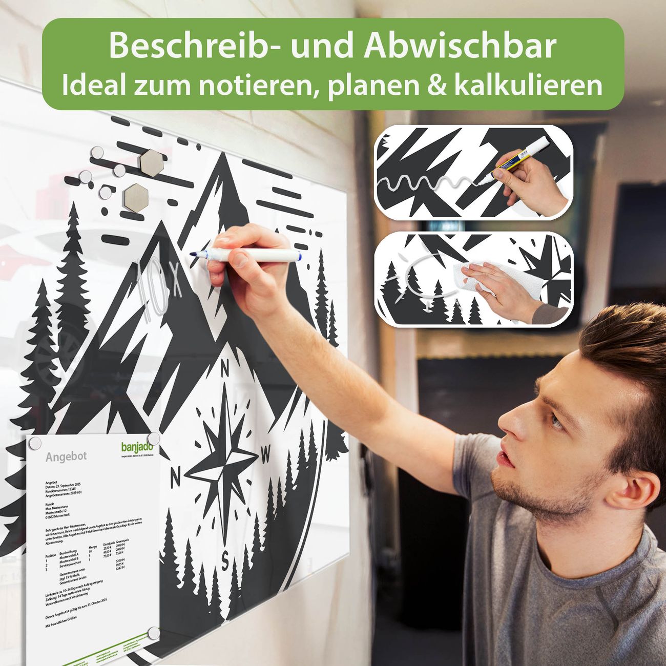 Material: 4mm Sicherheitsglas mit Metallrückwand Eigenschaften: beschreibbar, magnetisch, kratzfest Maße: 120x80x0,6cm, 14,40kg schwer Motiv Nummer 13275 Bergkompass Zubehör: inklusive 4 Neodym-Magnete
