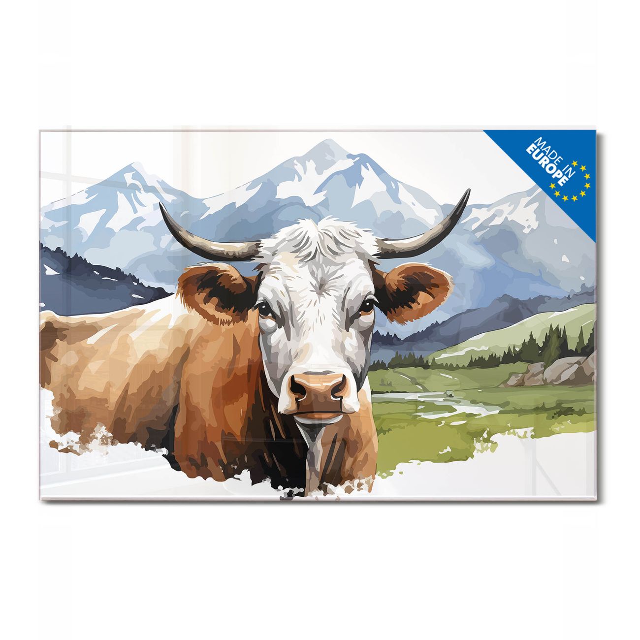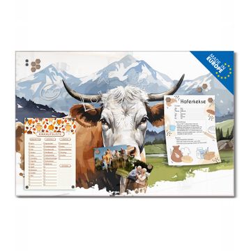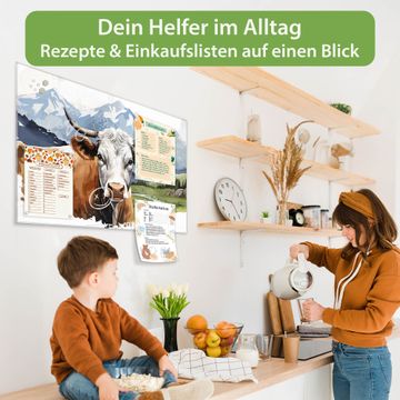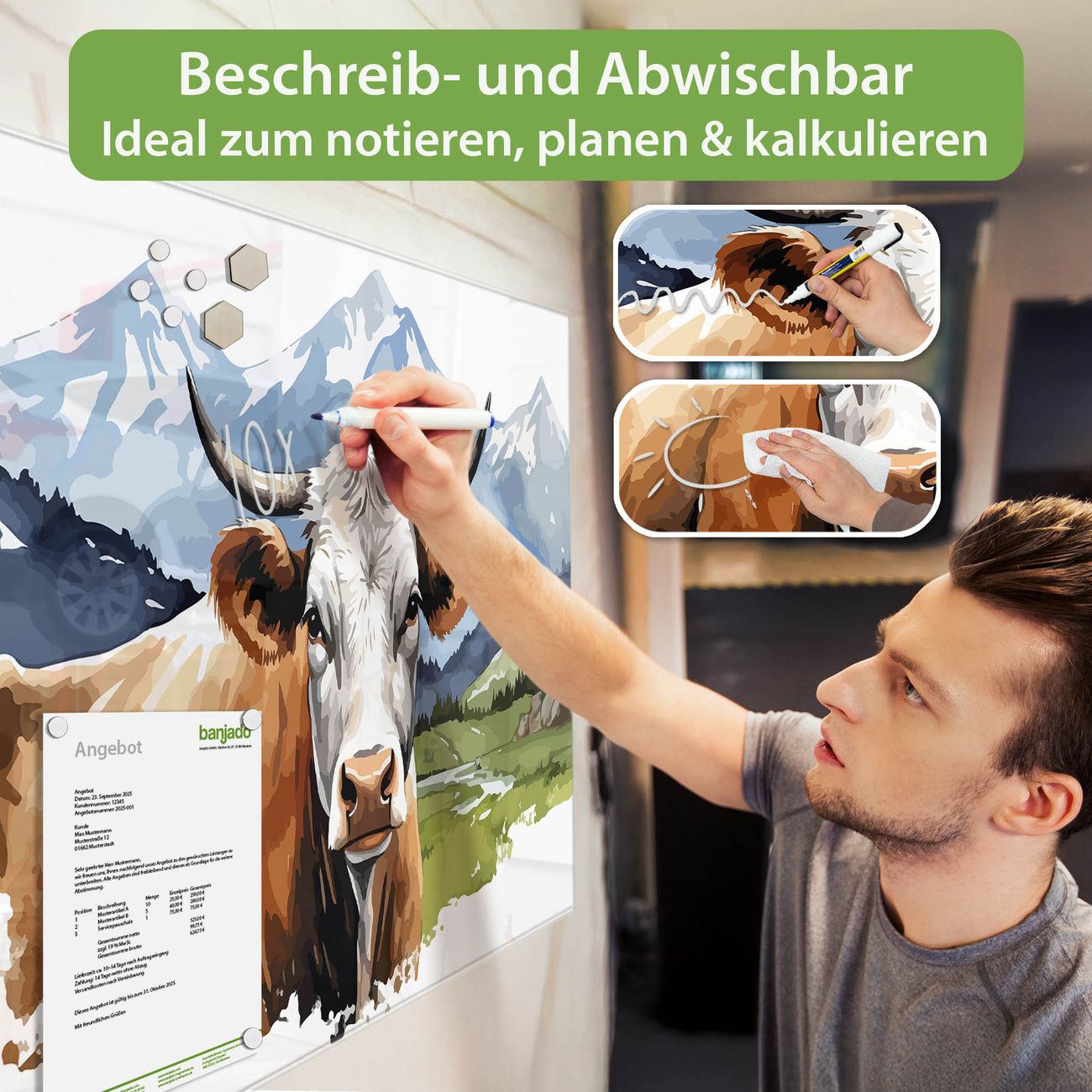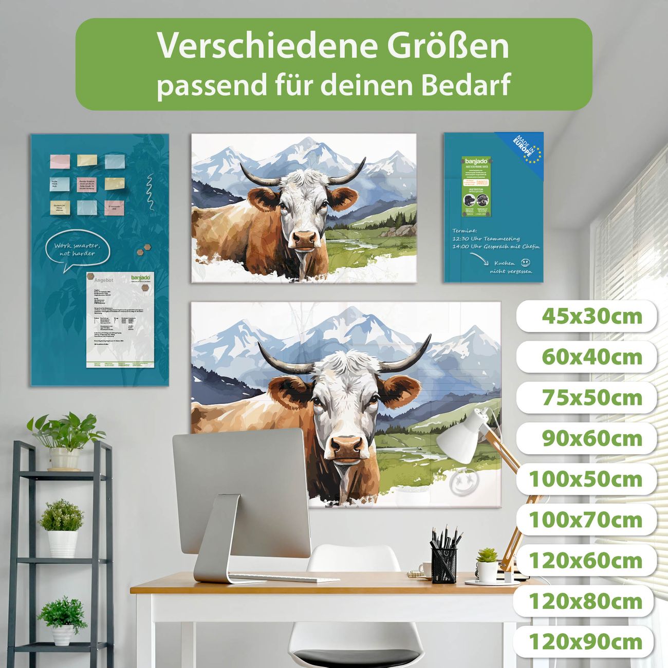 Material: 4mm Sicherheitsglas mit Metallrückwand Eigenschaften: beschreibbar, magnetisch, kratzfest Maße: 75x50x0,6cm, 5,63kg schwer Motiv Nummer 13455 Bergkuh in der Landschaft Zubehör: inklusive 4 Neodym-Magnete