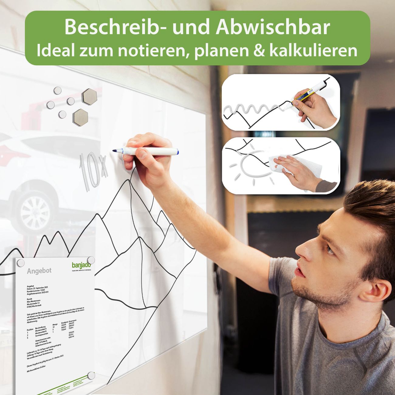 Auf der glatten Glasoberfläche lassen sich Termine, Rezepte oder Notizen ganz einfach mit Kreidestiften festhalten und rückstandslos entfernen. Starke Neodym-Magnete halten Ihre wichtigsten Erinnerungen sicher an Ort und Stelle. So entsteht Ihre ganz persönliche Ideenwand - jeden Tag neu.
