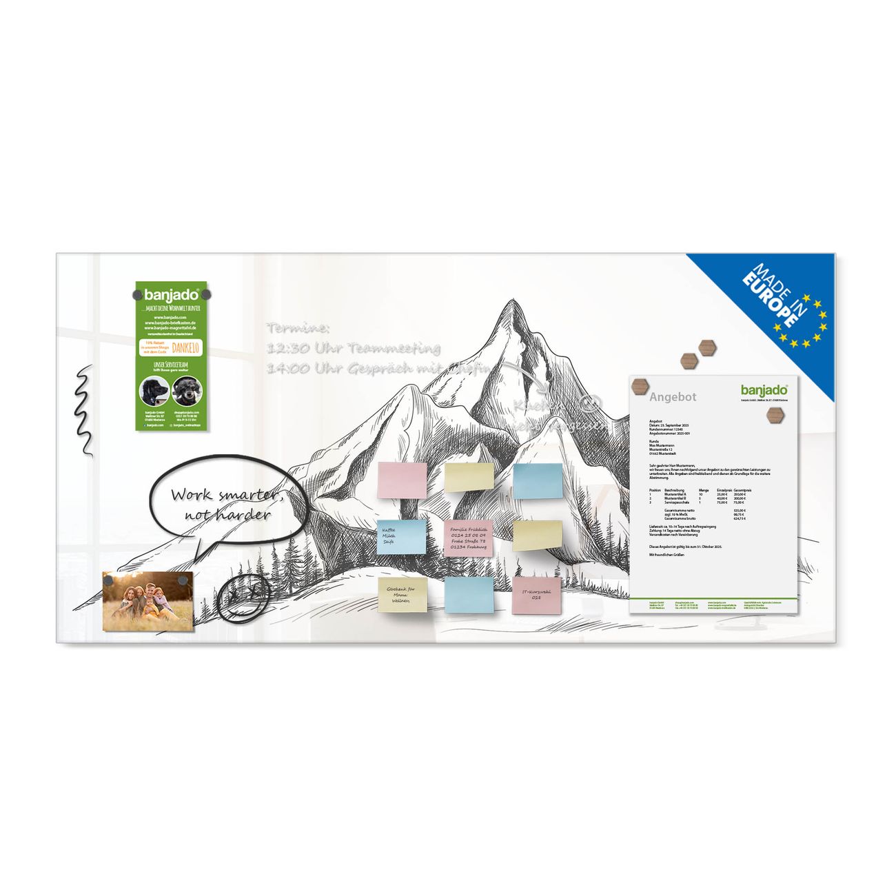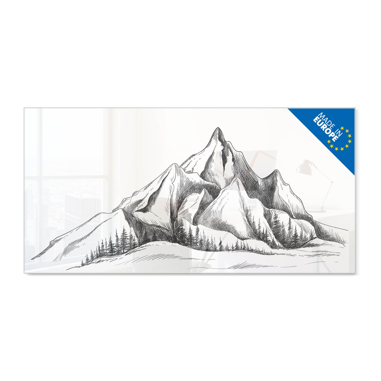 Material: 4mm Sicherheitsglas mit Metallrückwand Eigenschaften: beschreibbar, magnetisch, kratzfest Maße: 100x50x0,6cm, 7,50kg schwer Motiv Nummer 13274 Bergsilhouette Zubehör: inklusive 4 Neodym-Magnete