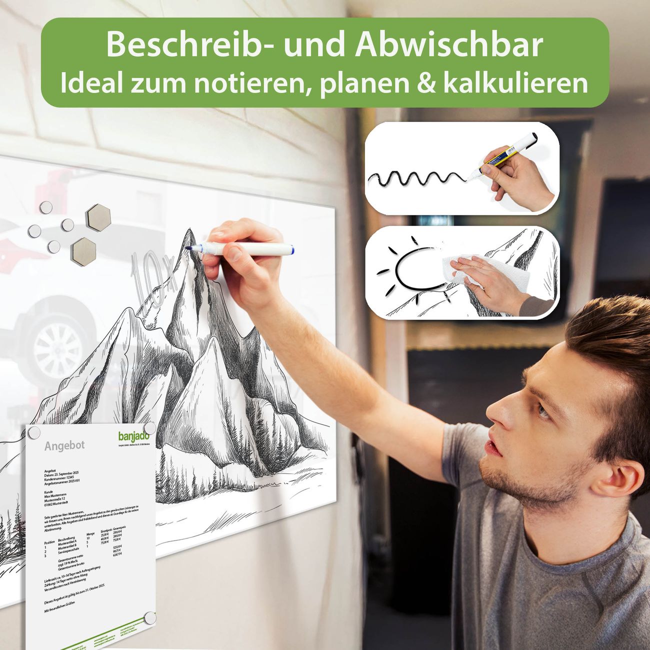 Jede Glas Magnettafel wird in unserer Werkstatt von Hand gefertigt und sorgfältig geprüft. So erhalten Sie ein echtes Qualitätsprodukt, das Funktion und Ästhetik perfekt vereint.?? Warum banjado?
