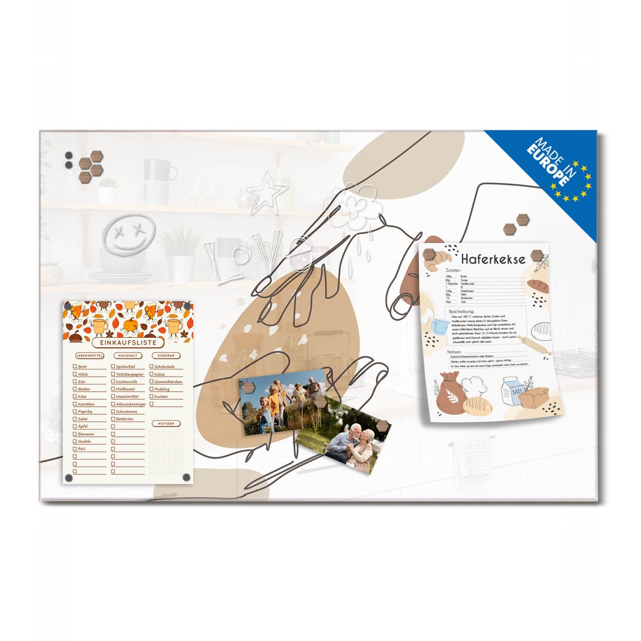 Ein Stück Design, das Ihren Alltag organisiert. Schreiben, heften, inspirieren - alles an einem Ort. Qualität, die man spürt. Montage leicht gemacht. Handwerk mit Herz - veredelt in Sachsen. Einzigartiges Design mit Motiv Motiv Berührende Verbindung Beschreibbare Glasoberfläche, leicht zu reinigen Starke Magnetkraft durch Stahlrückwand Inklusive 4 Neodym-Magneten Flexible Montageoptionen Handveredelt in Sachsen - Qualität, die bleibt