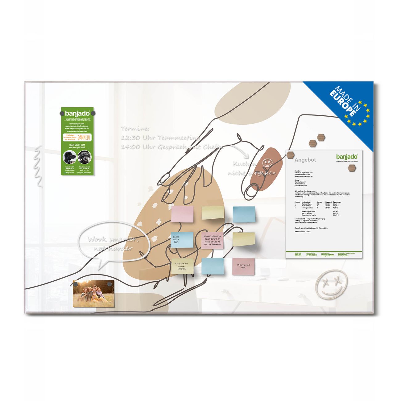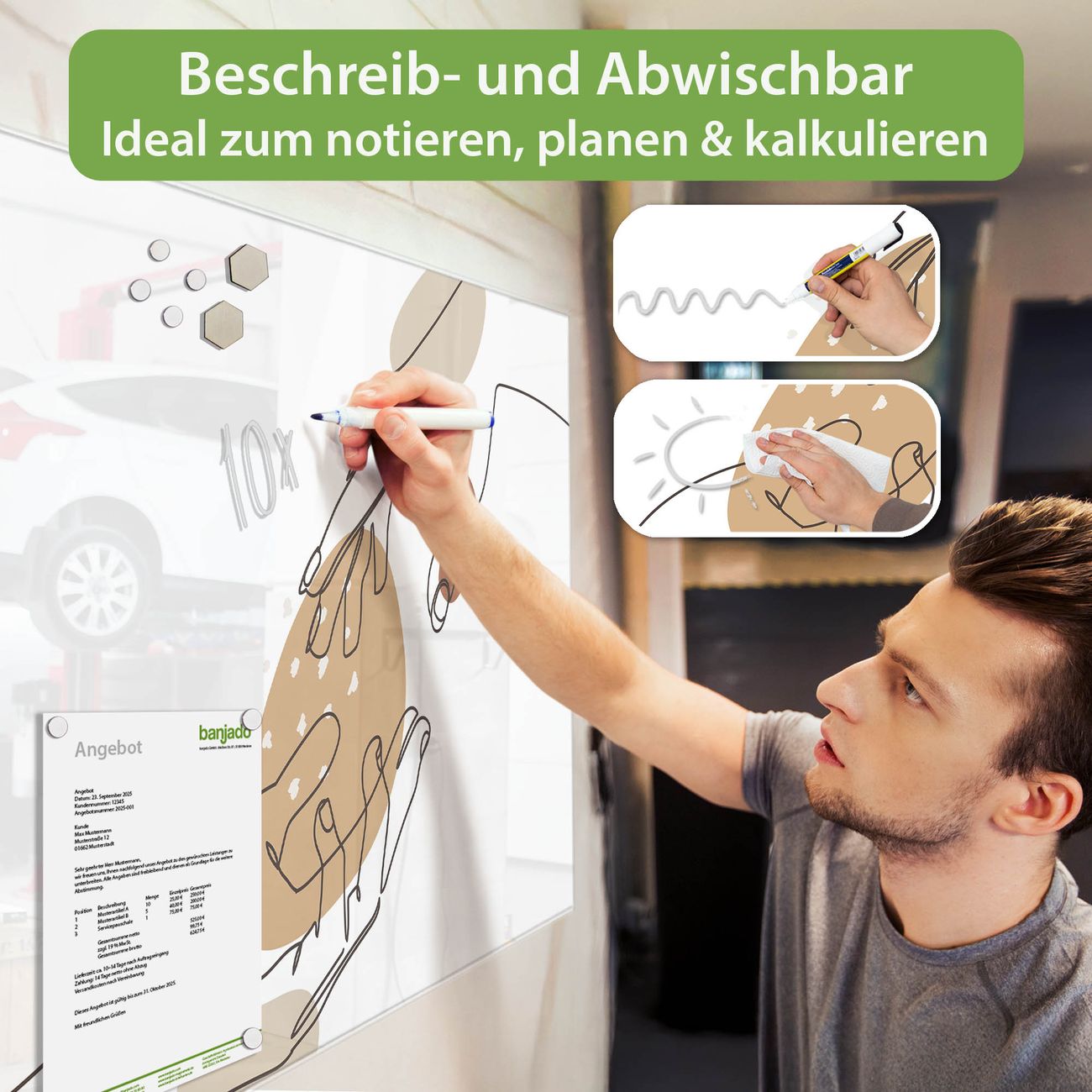 Jede Glas Magnettafel wird in unserer Werkstatt von Hand gefertigt und sorgfältig geprüft. So erhalten Sie ein echtes Qualitätsprodukt, das Funktion und Ästhetik perfekt vereint.?? Warum banjado?