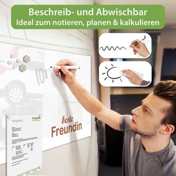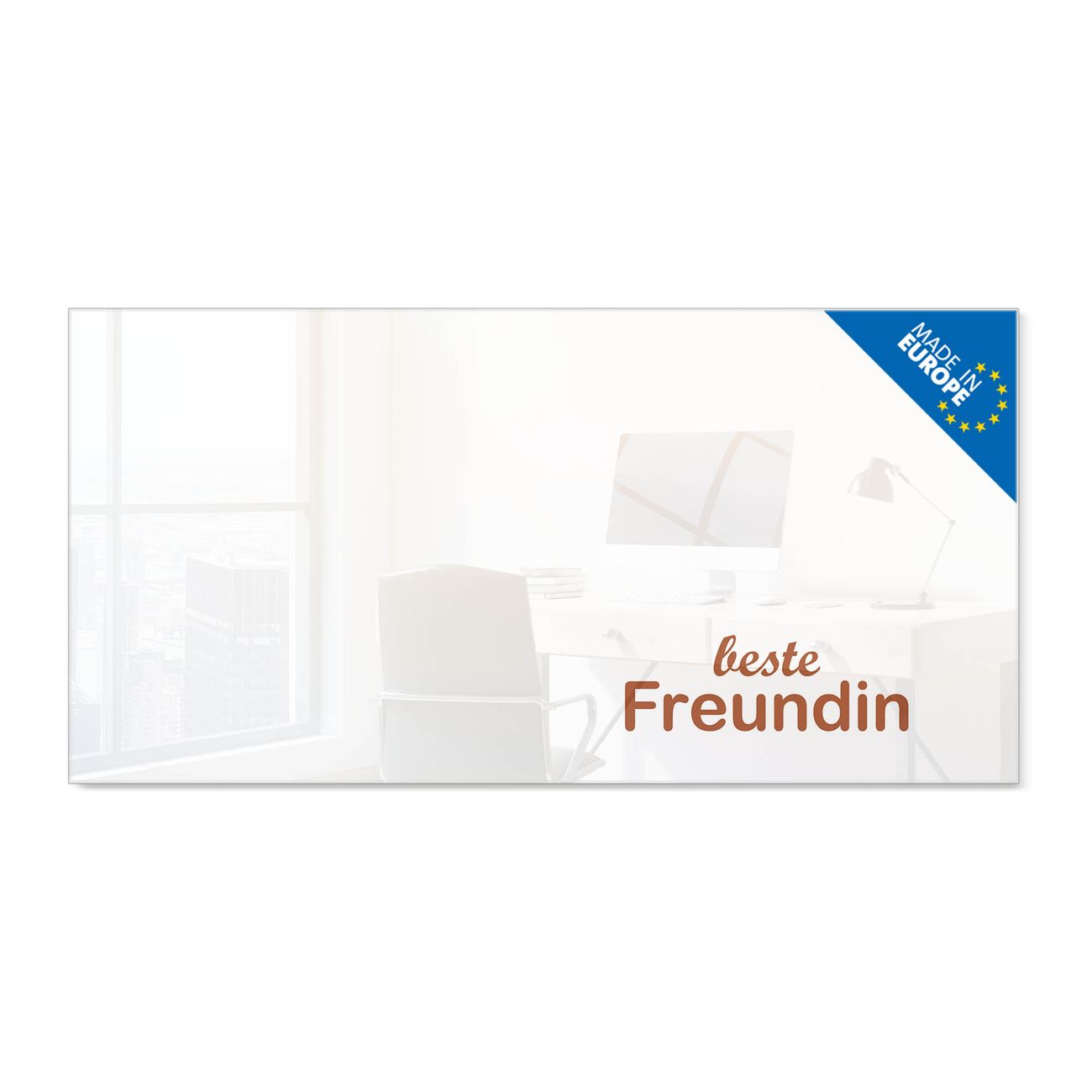 Material: 4mm Sicherheitsglas mit Metallrückwand Eigenschaften: beschreibbar, magnetisch, kratzfest Maße: 100x50x0,6cm, 7,50kg schwer Motiv Nummer 13127 beste Freundin 2 Zubehör: inklusive 4 Neodym-Magnete