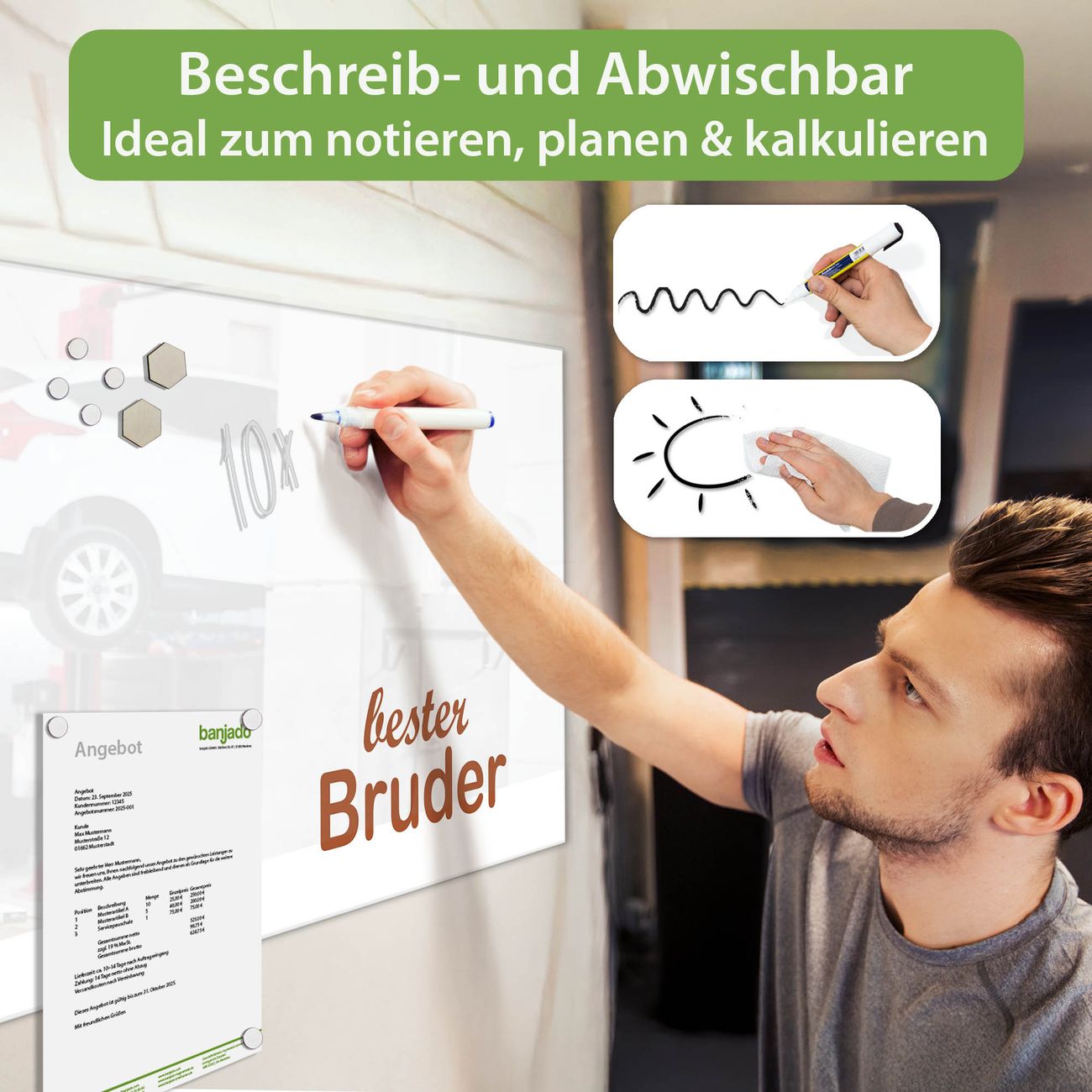 Material: 4mm Sicherheitsglas mit Metallrückwand Eigenschaften: beschreibbar, magnetisch, kratzfest Maße: 100x50x0,6cm, 7,50kg schwer Motiv Nummer 13122 bester Bruder 2 Zubehör: inklusive 4 Neodym-Magnete