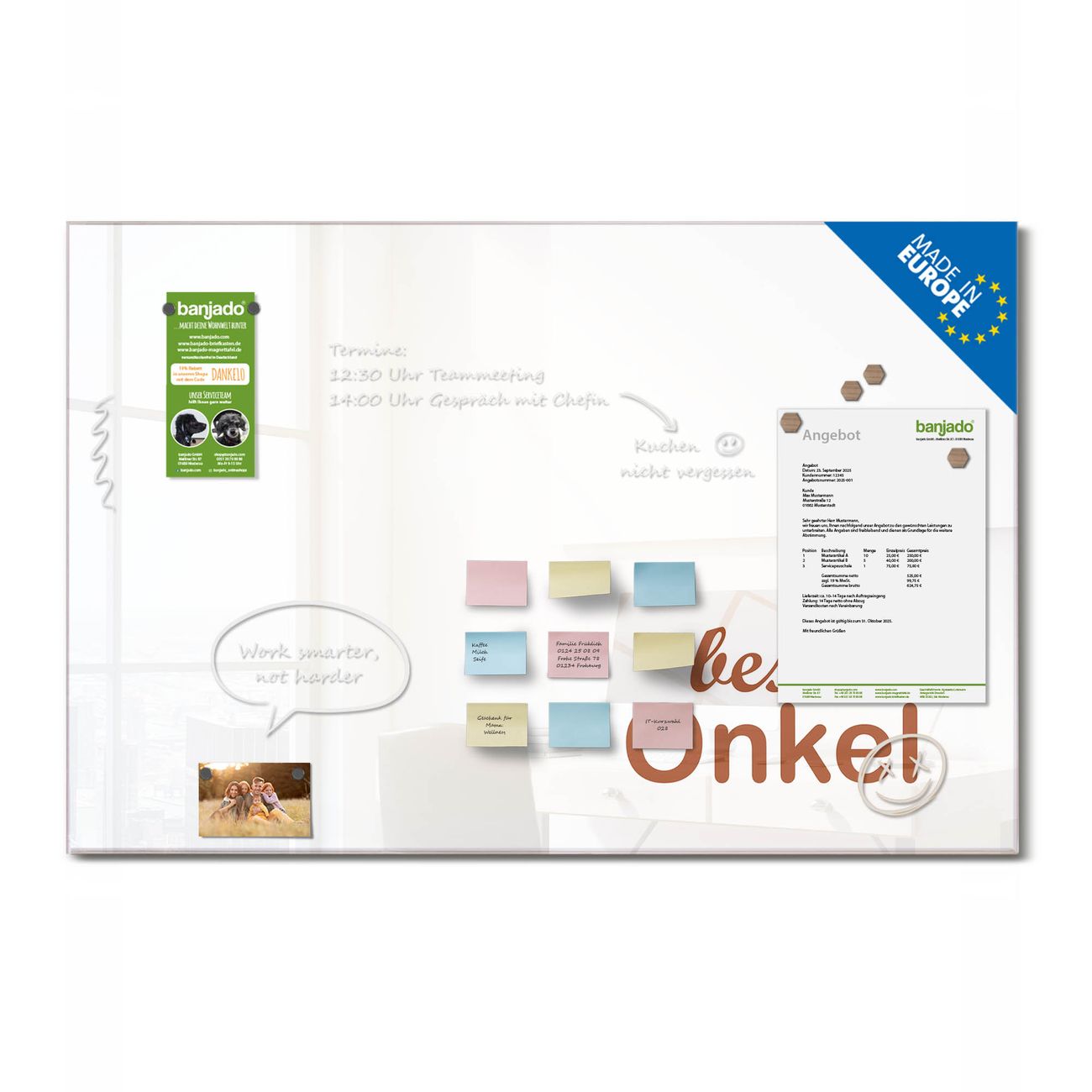 Jede Glas Magnettafel wird in unserer Werkstatt von Hand gefertigt und sorgfältig geprüft. So erhalten Sie ein echtes Qualitätsprodukt, das Funktion und Ästhetik perfekt vereint.?? Warum banjado?