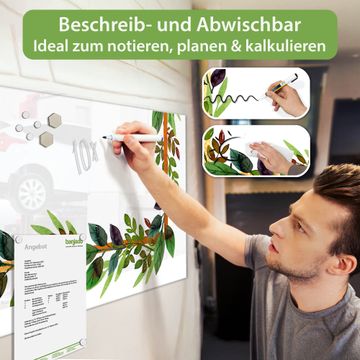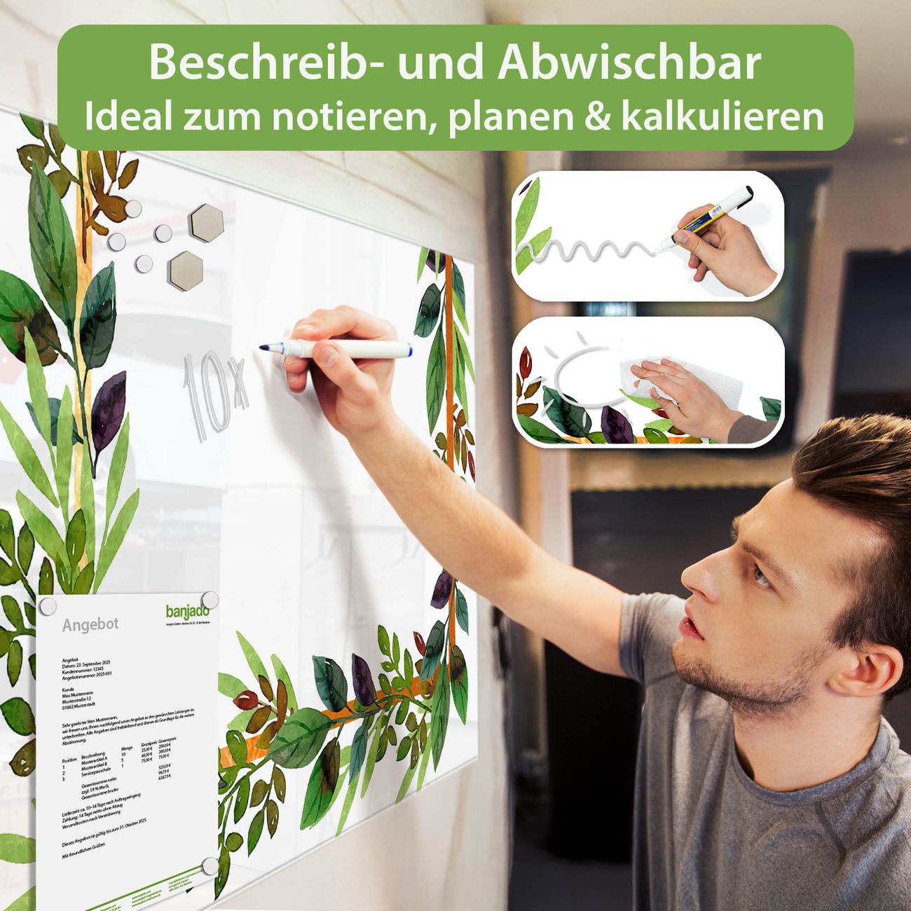 Die banjado Glas Magnettafel mit dem Motiv Motiv Blätterrahmen 2 verbindet Funktionalität mit Stil. Sie ersetzt das Zettelchaos durch klare Strukturen und bringt dabei eine warme, natürliche Atmosphäre in Ihr Zuhause. Ob im Büro, in der Küche oder im Eingangsbereich - dieses Design-Board zieht Blicke an und sorgt für Ordnung mit Charakter.