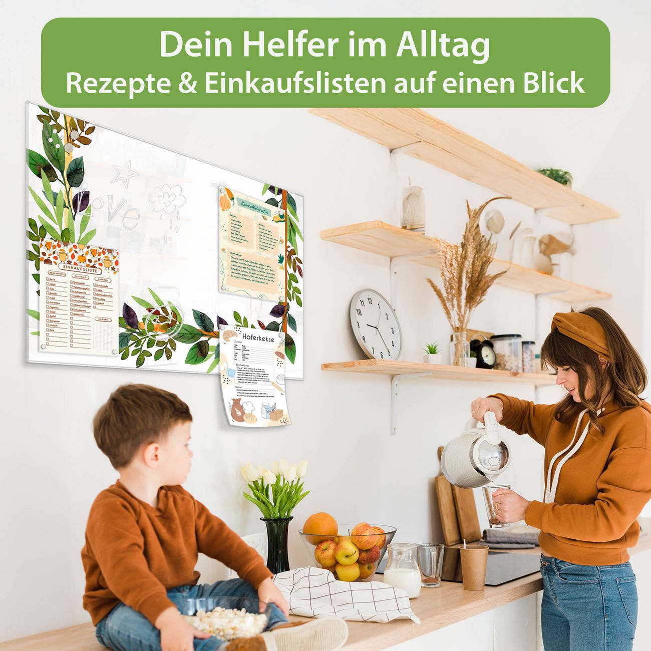 Auf der glatten Glasoberfläche lassen sich Termine, Rezepte oder Notizen ganz einfach mit Kreidestiften festhalten und rückstandslos entfernen. Starke Neodym-Magnete halten Ihre wichtigsten Erinnerungen sicher an Ort und Stelle. So entsteht Ihre ganz persönliche Ideenwand - jeden Tag neu.