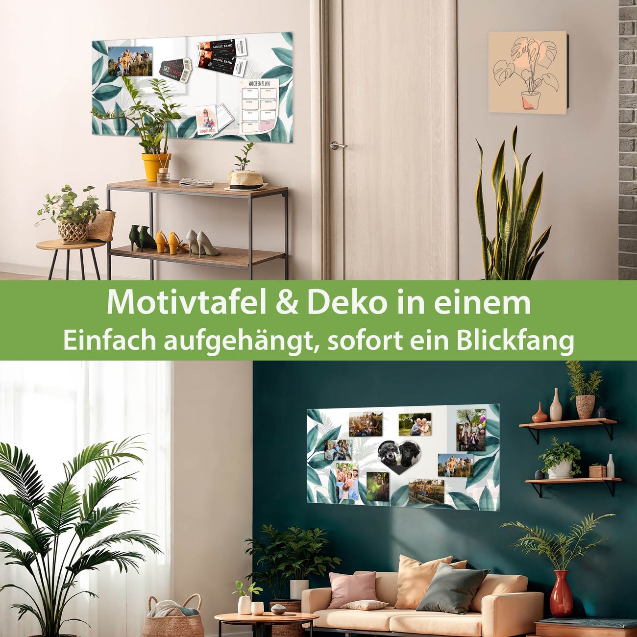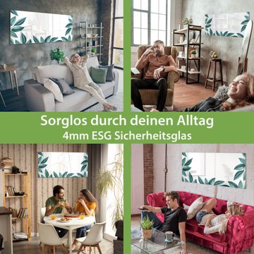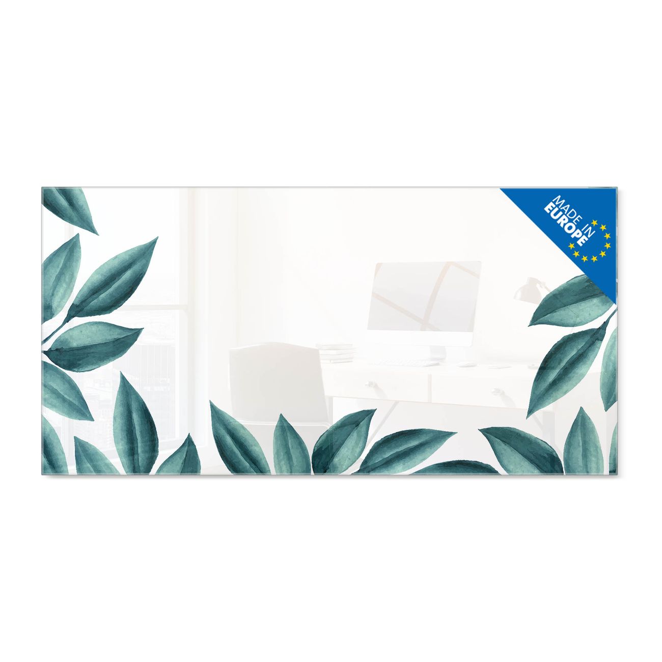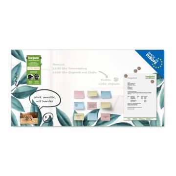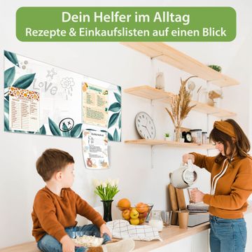 Material: 4mm Sicherheitsglas mit Metallrückwand Eigenschaften: beschreibbar, magnetisch, kratzfest Maße: 100x50x0,6cm, 7,50kg schwer Motiv Nummer 13502 Blätterrahmen Zubehör: inklusive 4 Neodym-Magnete