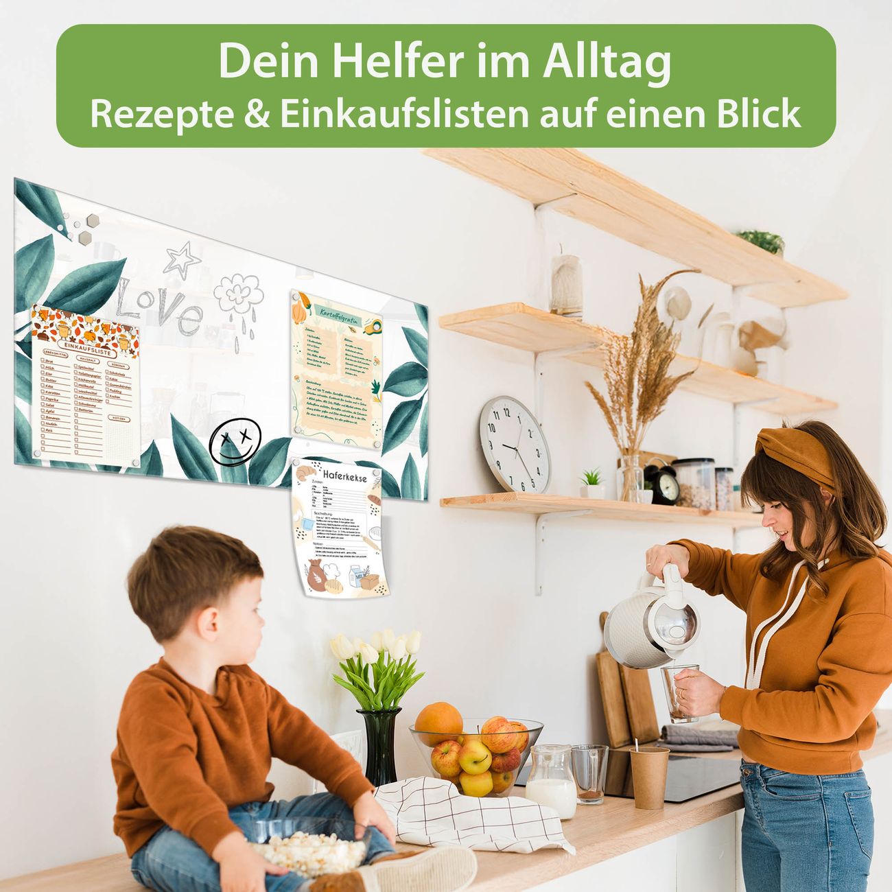 Auf der glatten Glasoberfläche lassen sich Termine, Rezepte oder Notizen ganz einfach mit Kreidestiften festhalten und rückstandslos entfernen. Starke Neodym-Magnete halten Ihre wichtigsten Erinnerungen sicher an Ort und Stelle. So entsteht Ihre ganz persönliche Ideenwand - jeden Tag neu.