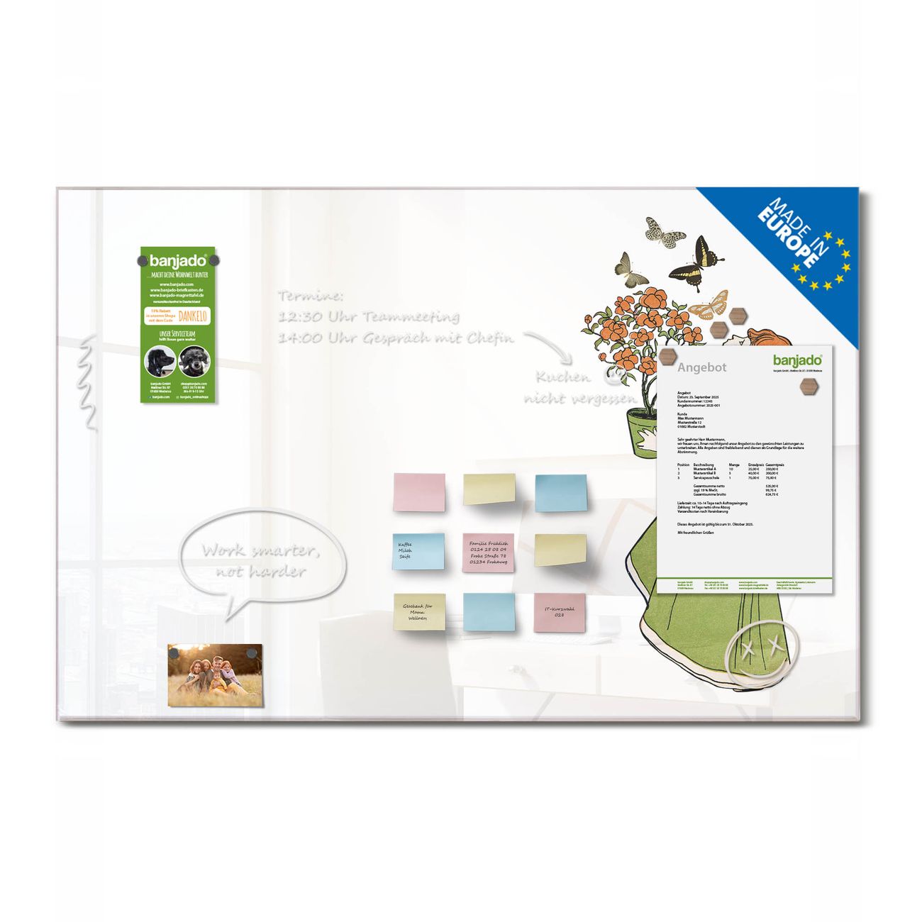 Material: 4mm Sicherheitsglas mit Metallrückwand Eigenschaften: beschreibbar, magnetisch, kratzfest Maße: 120x80x0,6cm, 14,40kg schwer Motiv Nummer 13379 Blütenfreude Zubehör: inklusive 4 Neodym-Magnete