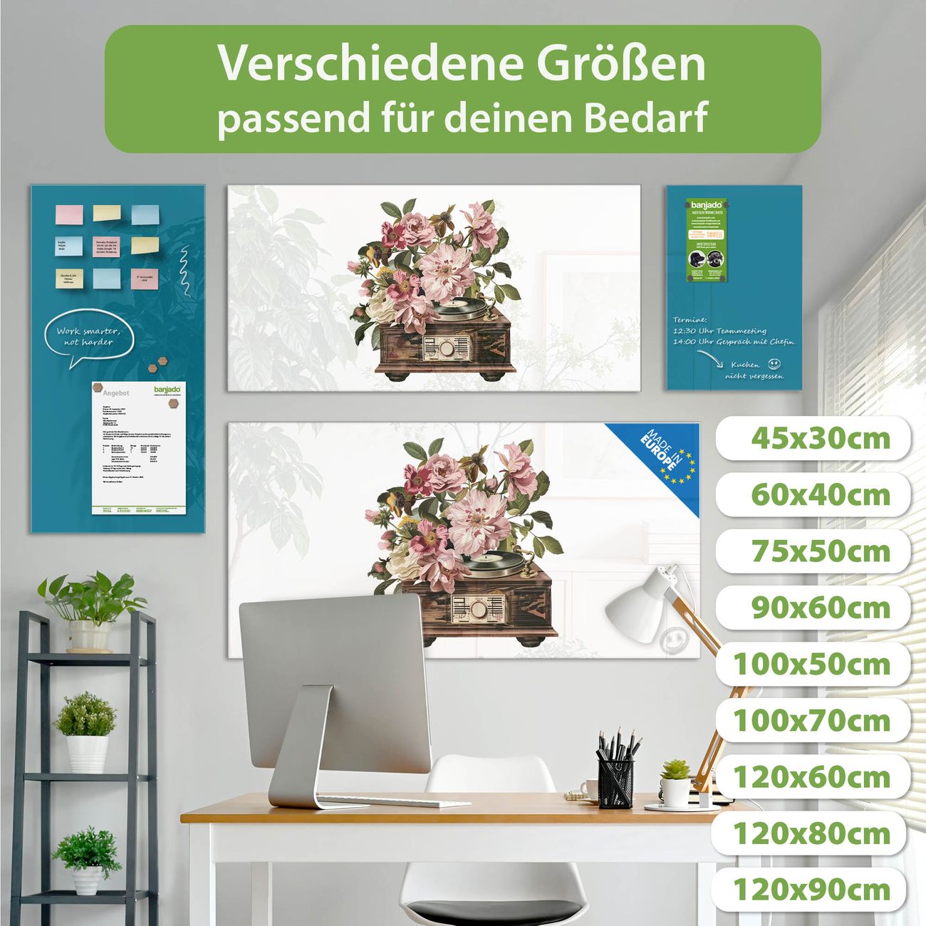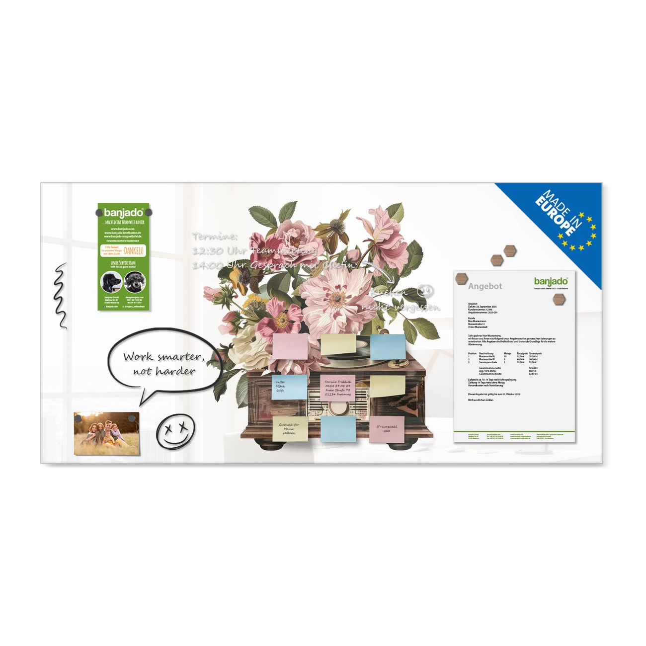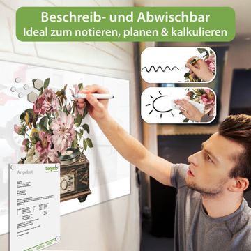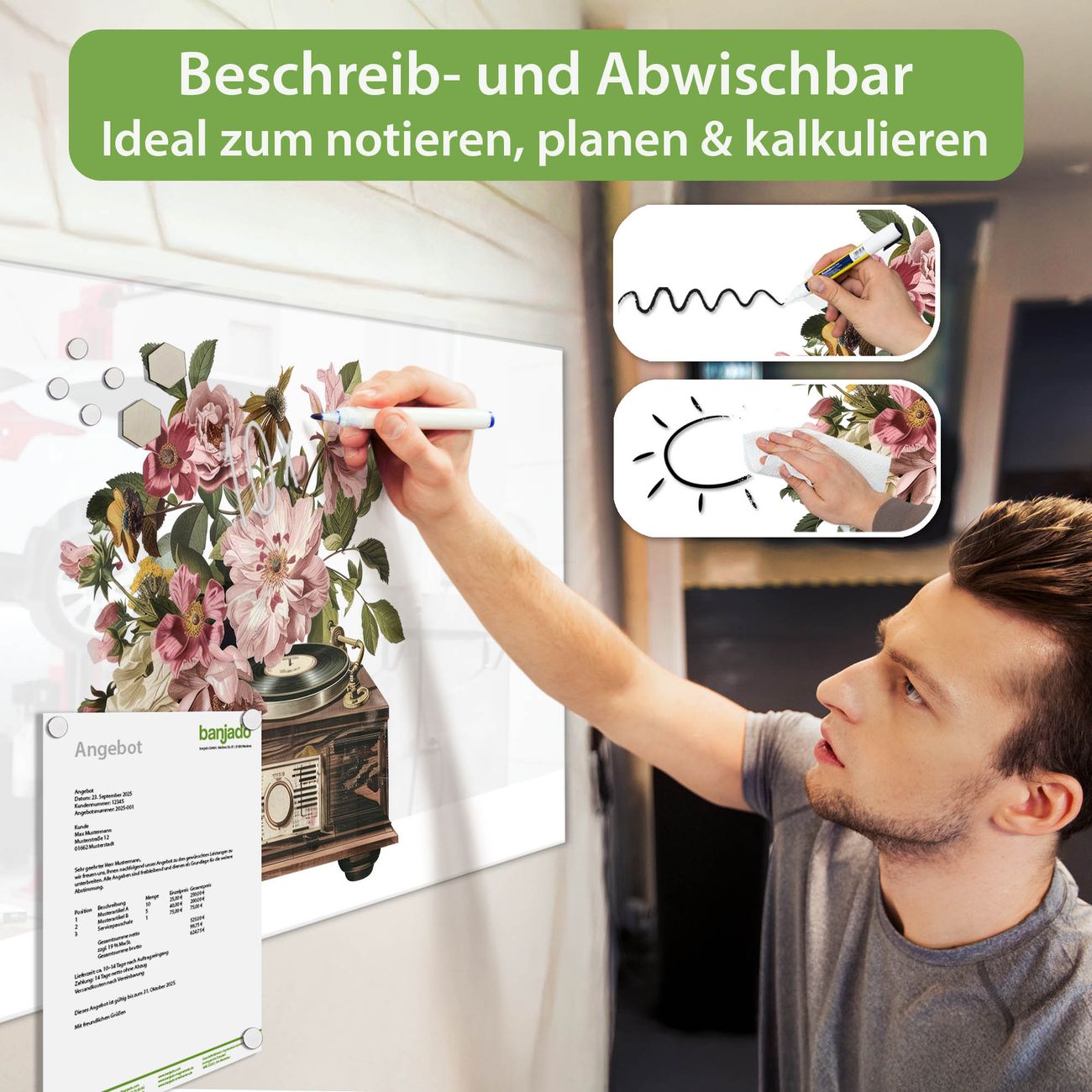 Material: 4mm Sicherheitsglas mit Metallrückwand Eigenschaften: beschreibbar, magnetisch, kratzfest Maße: 100x50x0,6cm, 7,50kg schwer Motiv Nummer 13380 Blütenklang Zubehör: inklusive 4 Neodym-Magnete