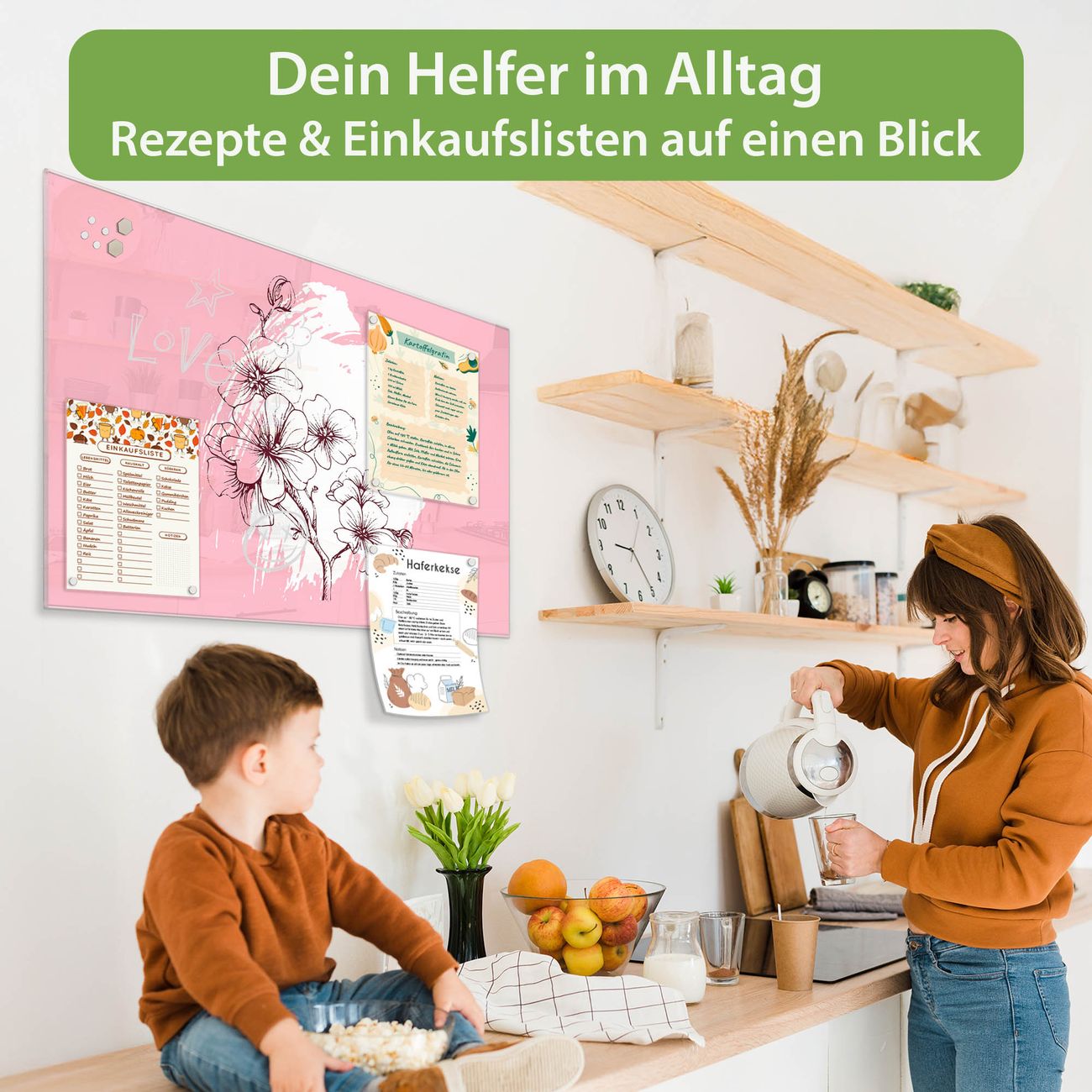 Auf der glatten Glasoberfläche lassen sich Termine, Rezepte oder Notizen ganz einfach mit Kreidestiften festhalten und rückstandslos entfernen. Starke Neodym-Magnete halten Ihre wichtigsten Erinnerungen sicher an Ort und Stelle. So entsteht Ihre ganz persönliche Ideenwand - jeden Tag neu.