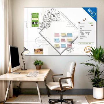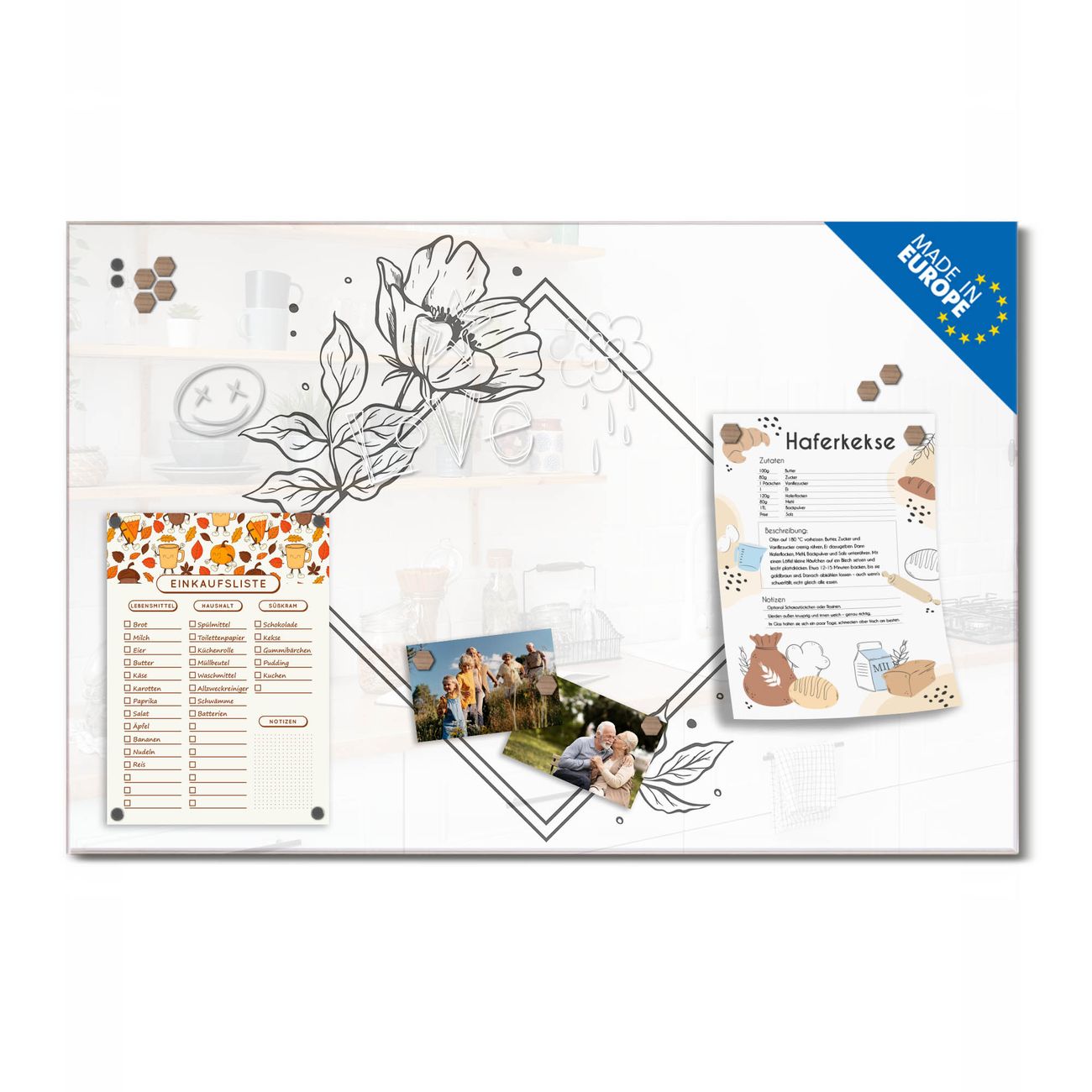 Material: 4mm Sicherheitsglas mit Metallrückwand Eigenschaften: beschreibbar, magnetisch, kratzfest Maße: 75x50x0,6cm, 5,63kg schwer Motiv Nummer 13530 Blütenrahmen Zubehör: inklusive 4 Neodym-Magnete