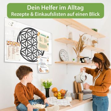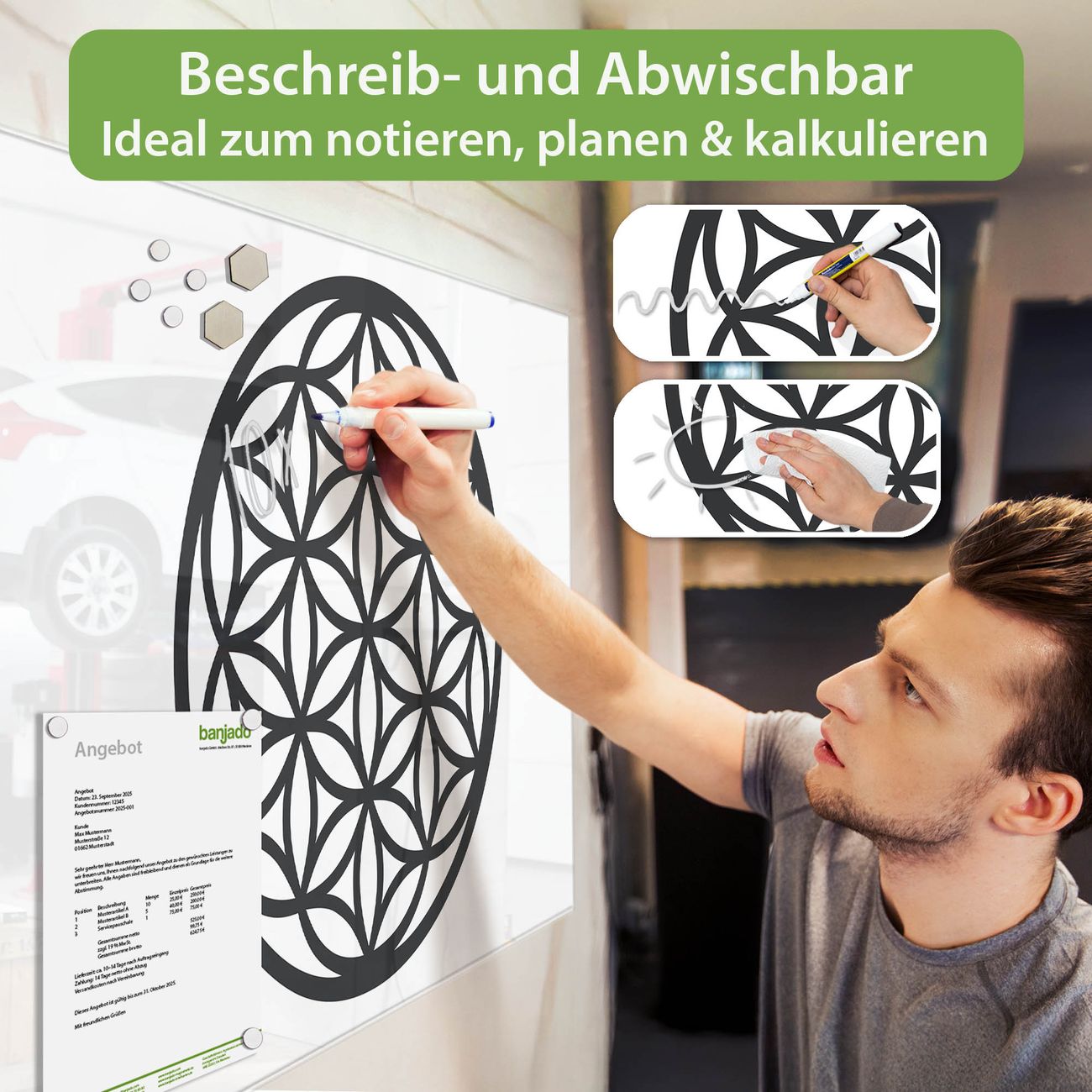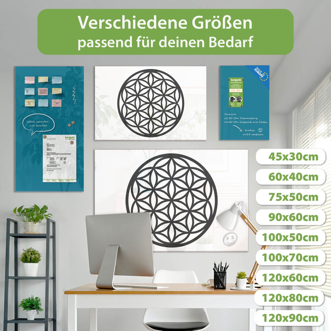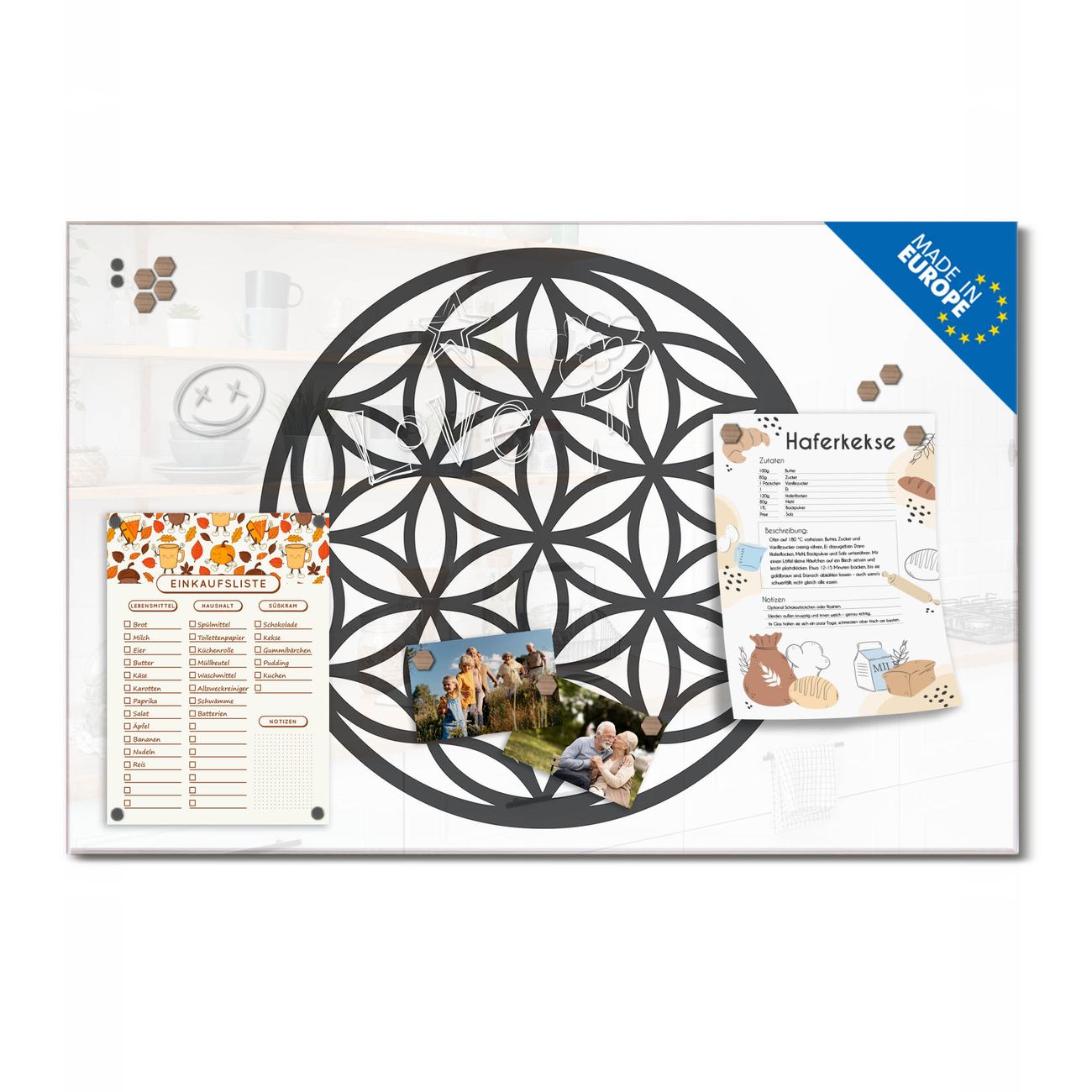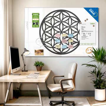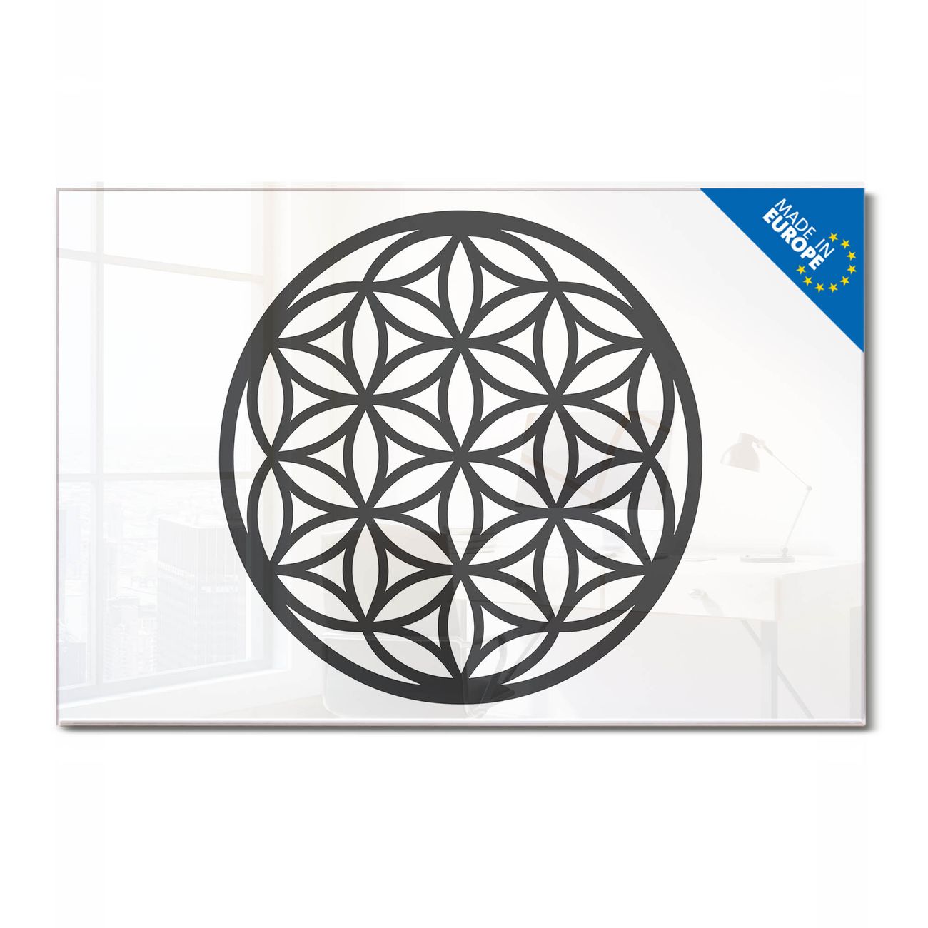 Material: 4mm Sicherheitsglas mit Metallrückwand Eigenschaften: beschreibbar, magnetisch, kratzfest Maße: 75x50x0,6cm, 5,63kg schwer Motiv Nummer 13387 Blume des Lebens Muster Zubehör: inklusive 4 Neodym-Magnete