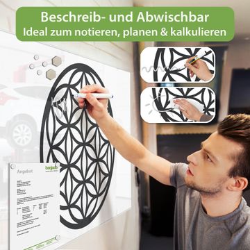 Ein Stück Design, das Ihren Alltag organisiert. Schreiben, heften, inspirieren - alles an einem Ort. Qualität, die man spürt. Montage leicht gemacht. Handwerk mit Herz - veredelt in Sachsen. Einzigartiges Design mit Motiv Motiv Blume des Lebens Muster Beschreibbare Glasoberfläche, leicht zu reinigen Starke Magnetkraft durch Stahlrückwand Inklusive 4 Neodym-Magneten Flexible Montageoptionen Handveredelt in Sachsen - Qualität, die bleibt