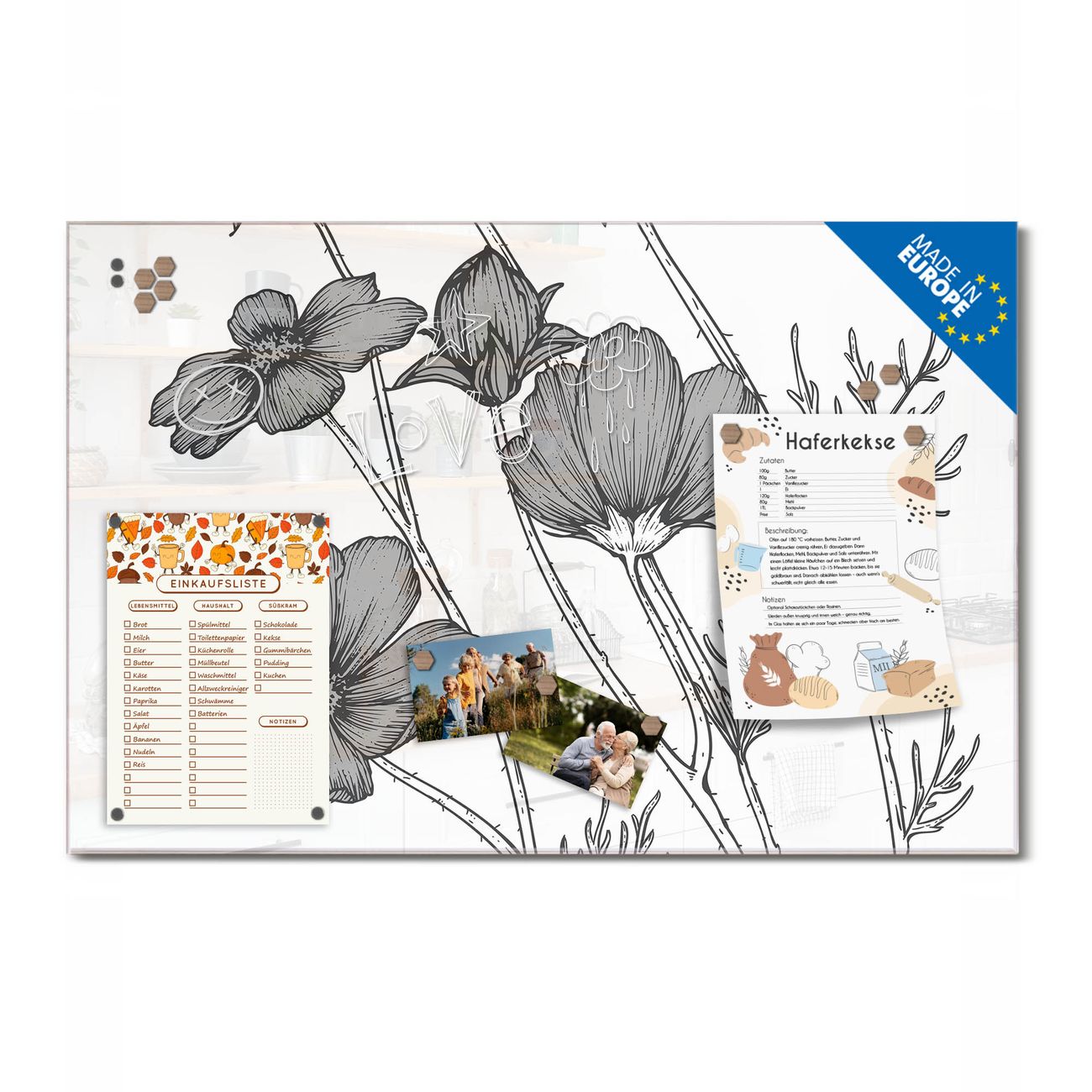 Material: 4mm Sicherheitsglas mit Metallrückwand Eigenschaften: beschreibbar, magnetisch, kratzfest Maße: 75x50x0,6cm, 5,63kg schwer Motiv Nummer 13204 Blumen in Schwarz-Weiß Zubehör: inklusive 4 Neodym-Magnete