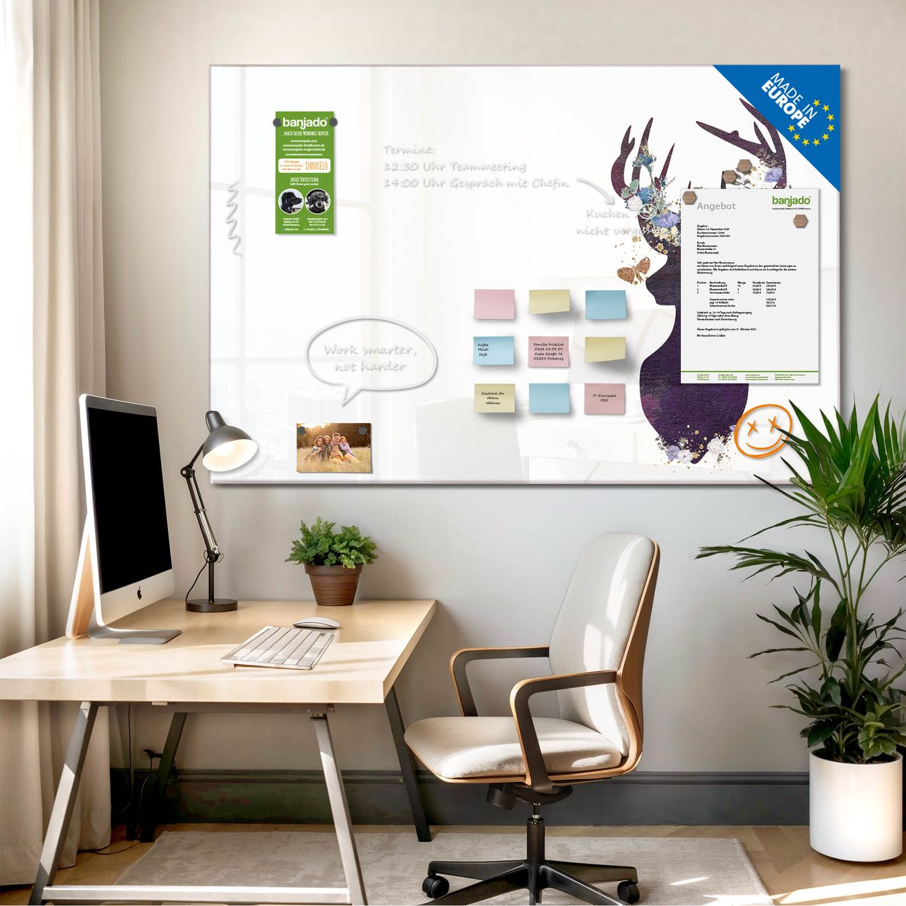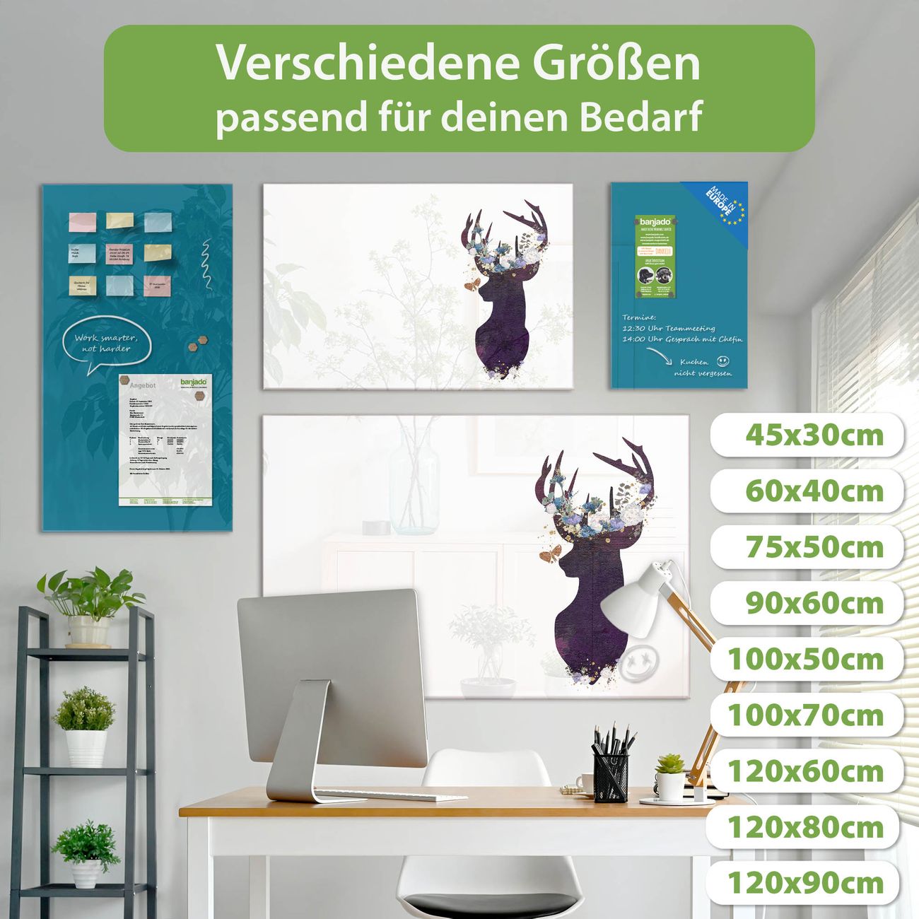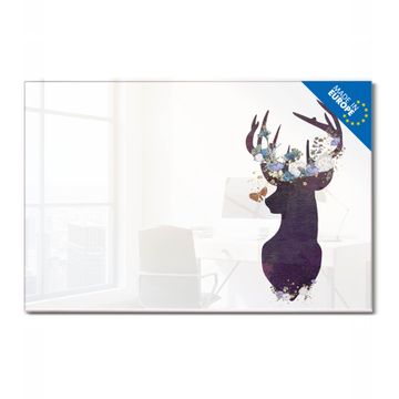 Material: 4mm Sicherheitsglas mit Metallrückwand Eigenschaften: beschreibbar, magnetisch, kratzfest Maße: 45x30x0,6cm, 2,03kg schwer Motiv Nummer 13403 Blumengeweih-Hirsch Zubehör: inklusive 4 Neodym-Magnete