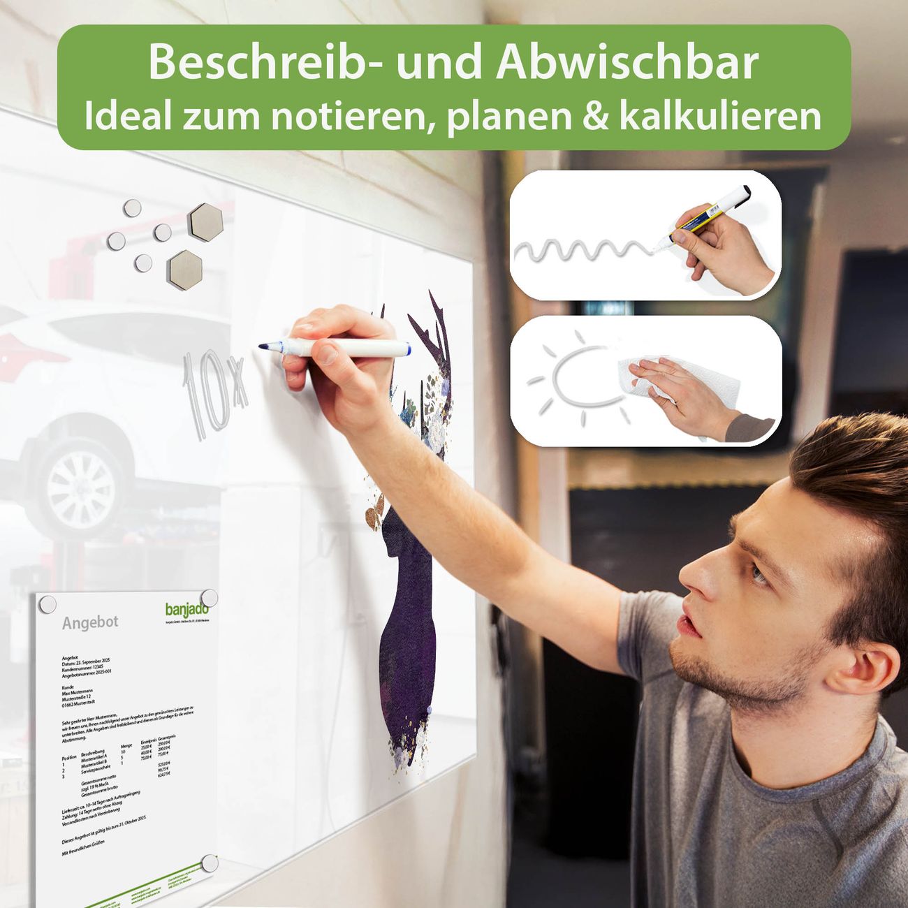 Bitte beachten Sie, dass ausschliessliche spezielle Magnete an der Glastafel haften. Wir empfehlen banjado Neodym Magnete, diese sind durch uns auf Wirksamkeit geprüft.