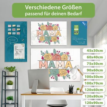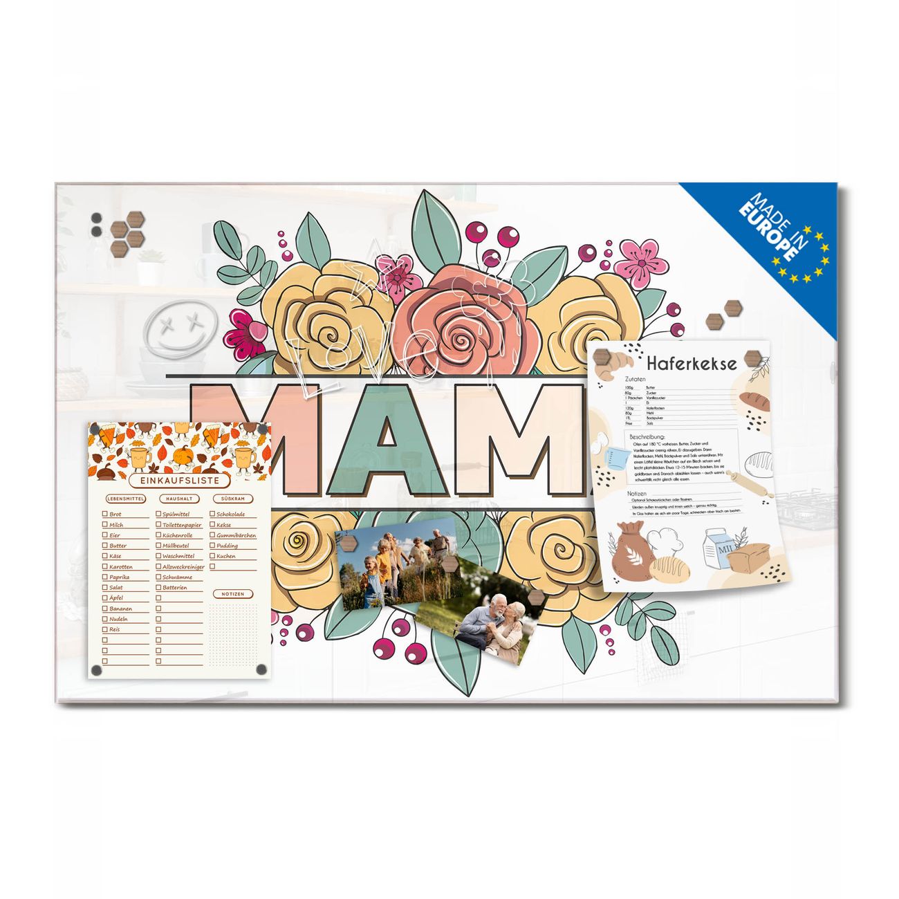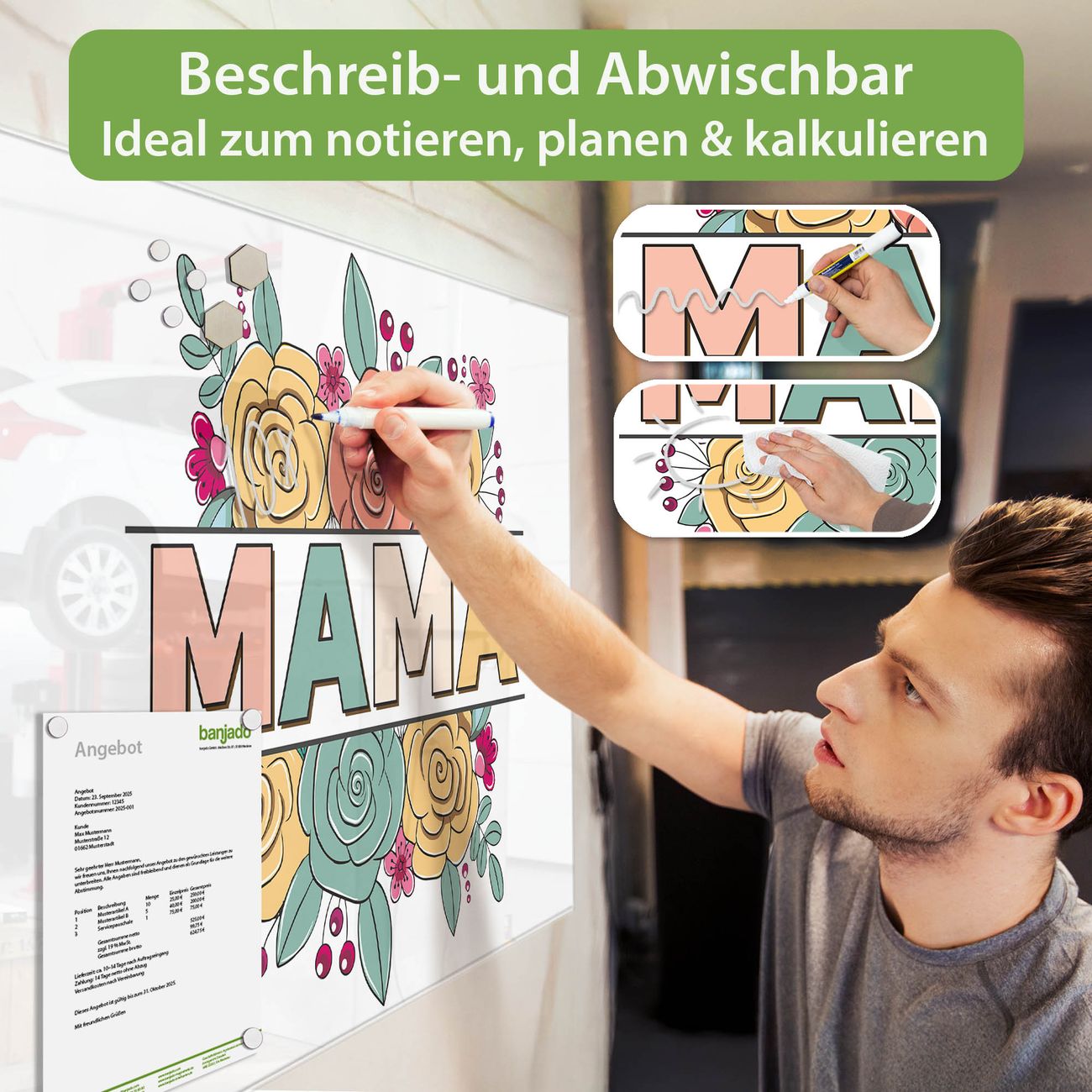 Material: 4mm Sicherheitsglas mit Metallrückwand Eigenschaften: beschreibbar, magnetisch, kratzfest Maße: 45x30x0,6cm, 2,03kg schwer Motiv Nummer 13362 Blumengruß für Mama Zubehör: inklusive 4 Neodym-Magnete