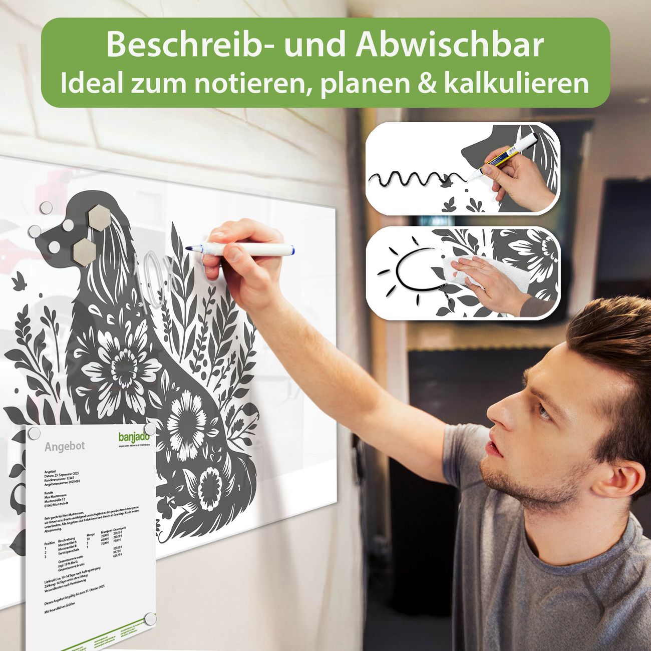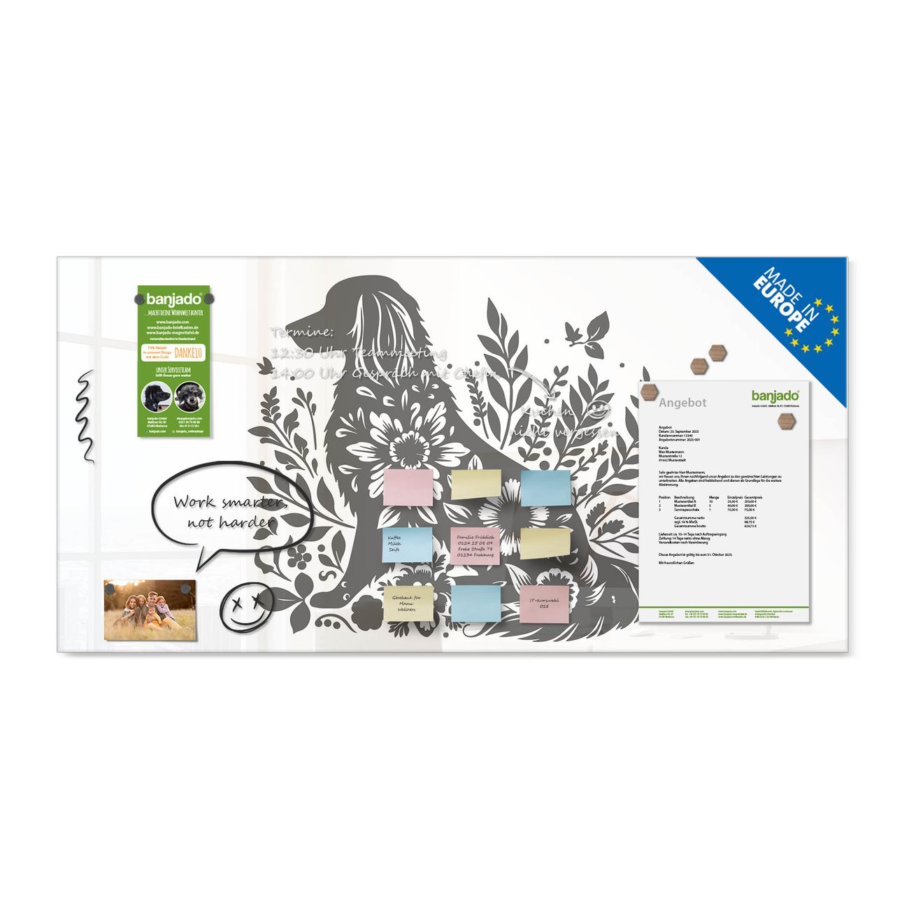 Material: 4mm Sicherheitsglas mit Metallrückwand Eigenschaften: beschreibbar, magnetisch, kratzfest Maße: 100x50x0,6cm, 7,50kg schwer Motiv Nummer 13409 Blumenhund Silhouette Zubehör: inklusive 4 Neodym-Magnete
