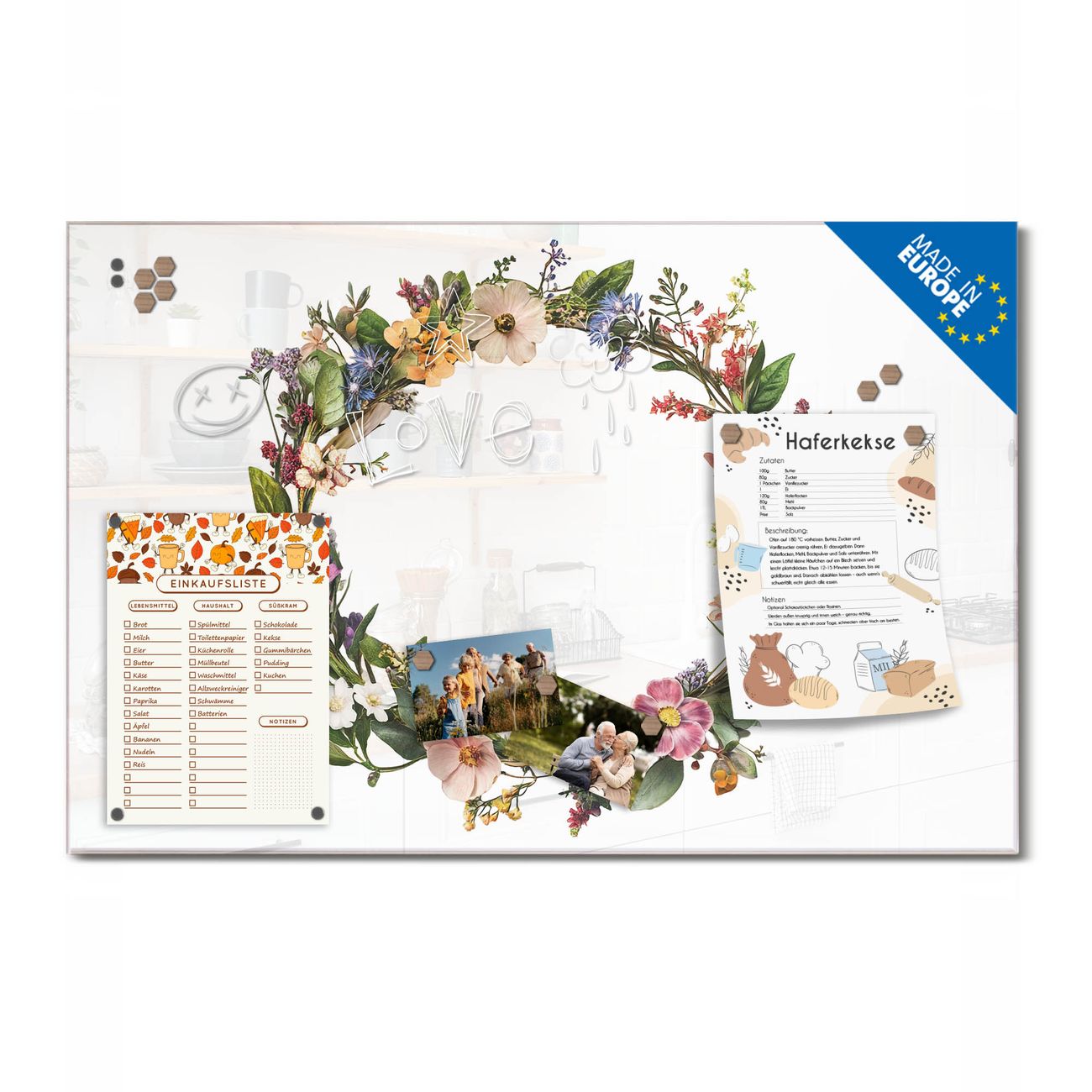 Material: 4mm Sicherheitsglas mit Metallrückwand Eigenschaften: beschreibbar, magnetisch, kratzfest Maße: 75x50x0,6cm, 5,63kg schwer Motiv Nummer 13513 Blumenkranz der Jahreszeiten Zubehör: inklusive 4 Neodym-Magnete