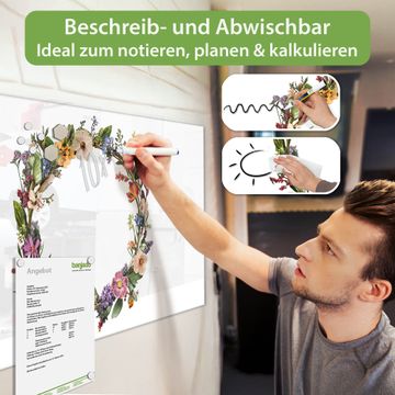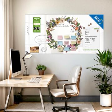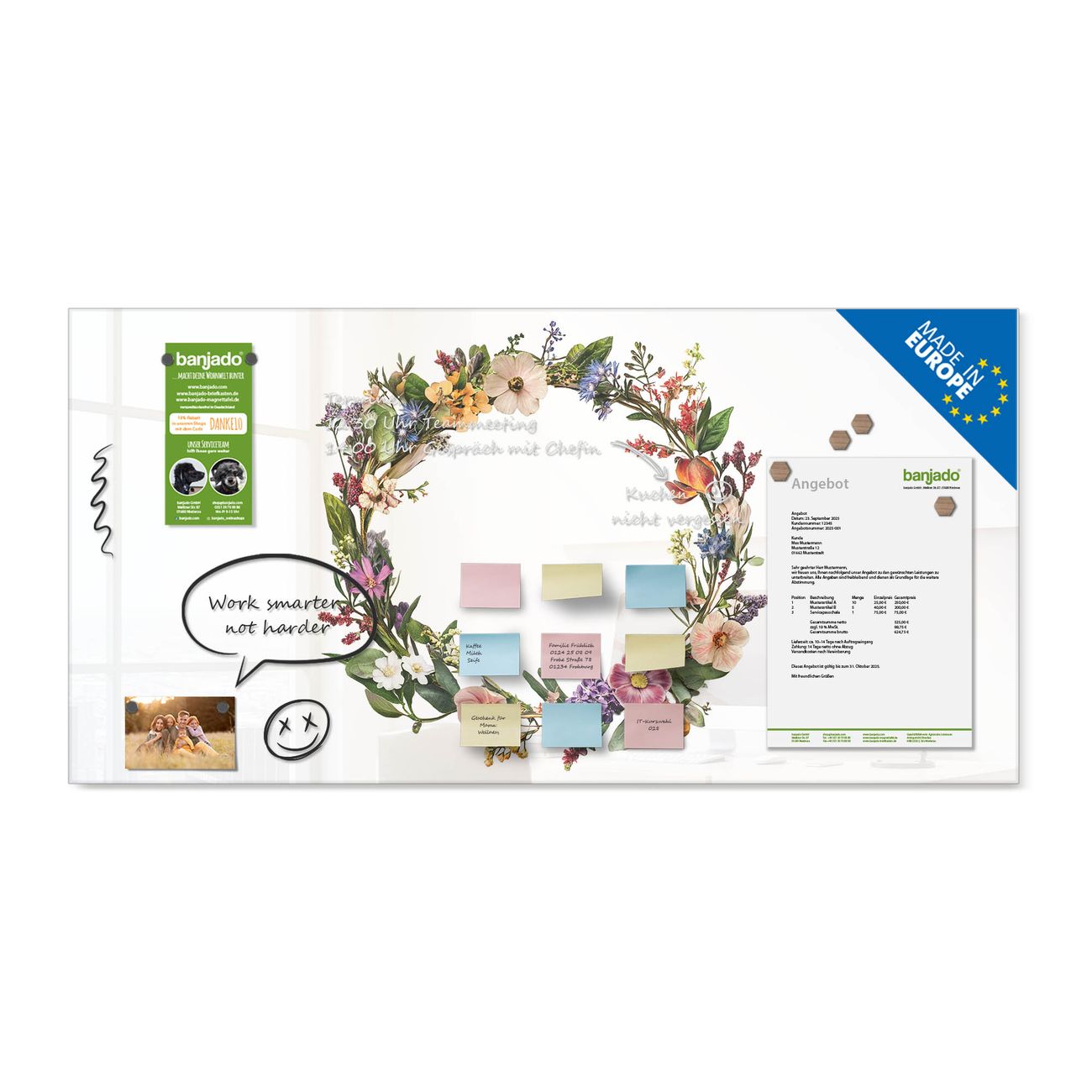 Die banjado Glas Magnettafel mit dem Motiv Motiv Blumenkranz der Jahreszeiten verbindet Funktionalität mit Stil. Sie ersetzt das Zettelchaos durch klare Strukturen und bringt dabei eine warme, natürliche Atmosphäre in Ihr Zuhause. Ob im Büro, in der Küche oder im Eingangsbereich - dieses Design-Board zieht Blicke an und sorgt für Ordnung mit Charakter.